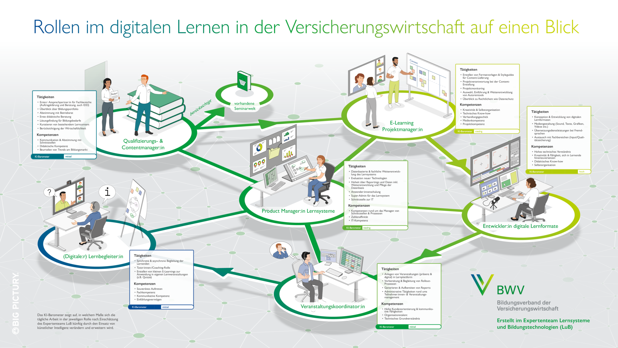 The association represents the interests of the industry vis-à-vis education policy decision-makers, shapes a permeable education system and strengthens examination quality. It also acts as an information hub for education and training. Its members are numerous insurance companies and the board is made up of leading representatives from the industry. The BWV promotes knowledge transfer and the digitalization of learning with its “Learning Systems and Educational Technologies” (LuB) team of experts. The concept for the Big Picture “Roles in digital learning in the insurance industry” was developed as part of this team.