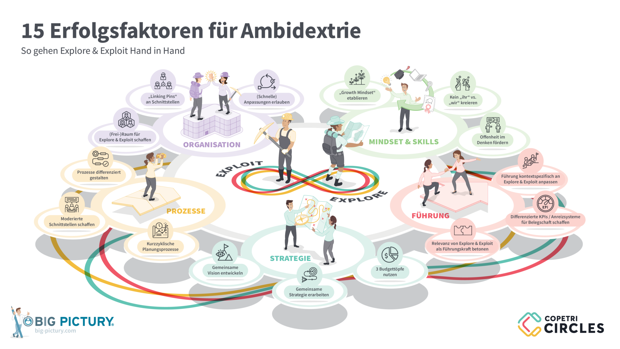 The Ambidextry Circle is concerned with the ability of companies to optimise what they already have and to develop something new. Together, the group has defined 15 success factors for this ability, which are also reflected in the visualisation.
