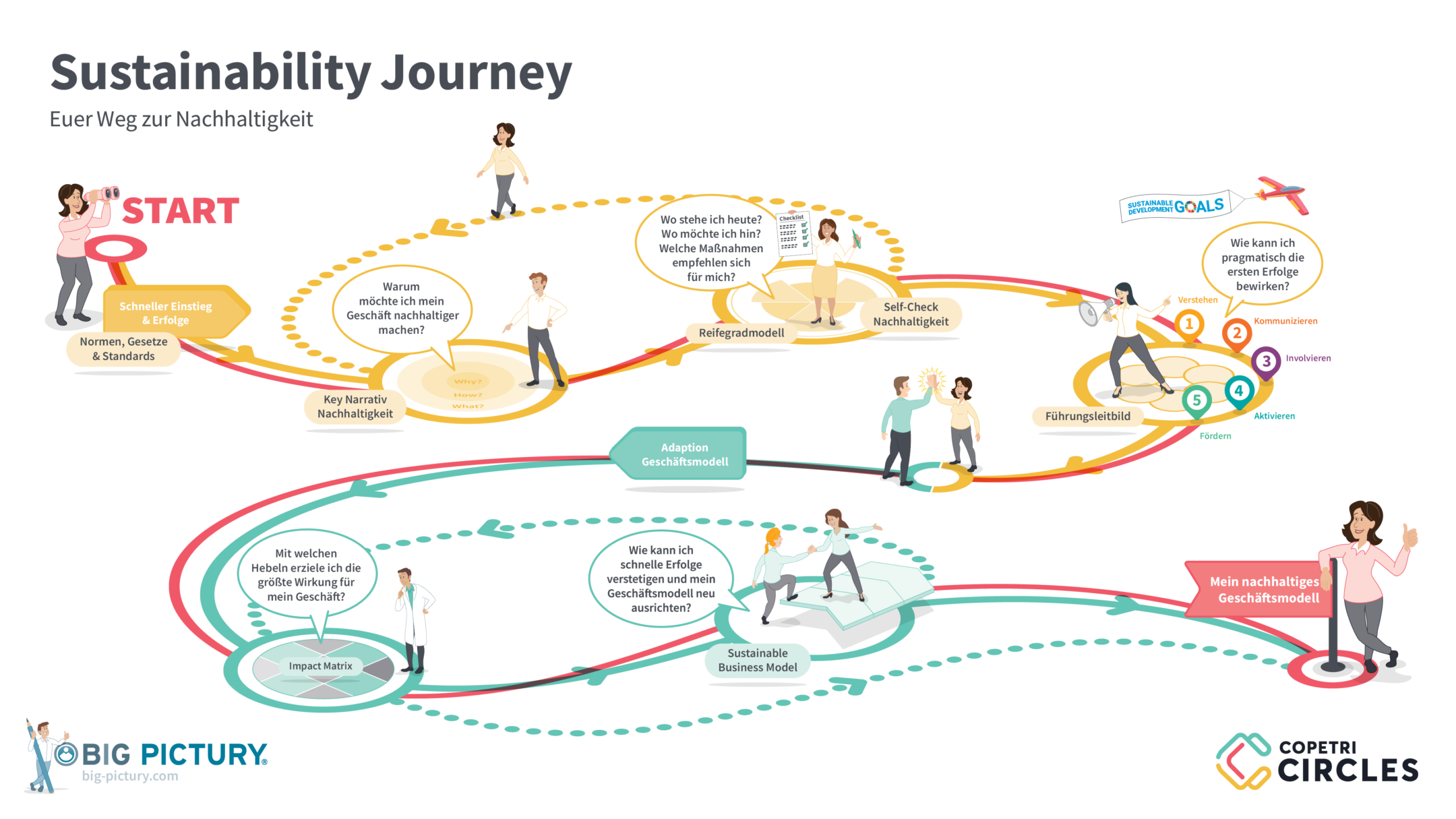 Companies today are not only socially and globally responsible for sustainable progress. They are also dependent on sustainable offers and processes for their own success. To achieve this, they must develop the topic strategically and anchor it throughout the organisation. This COPETRI CIRCLE designs ideas and practical solutions for this. Our visualisation shows this sustainability journey and tries to remove possible inhibitions through a simple representation of the process.