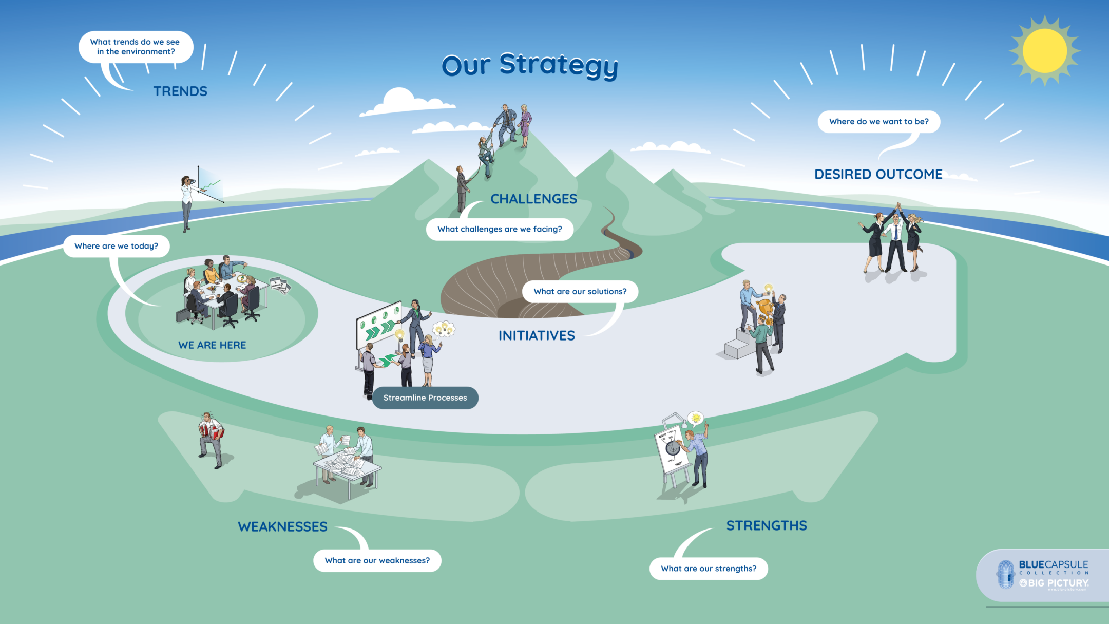In close cooperation with EEW, the strategists and creatives of Big Pictury created a unique Big Picture within one month, based on a strategy map template, which visually sums up EEW’s corporate strategy. The Big Picture paints a clear and easy-to-understand picture of EEW’s path to sustainable success: including external factors, goals, challenges, approaches to solutions, as well as weaknesses that the company will work on in the future to achieve its business goals faster. This Big Picture was used as a large trade fair display, as part of a management meeting at EEW. So far, the response from employees has been overwhelmingly positive: