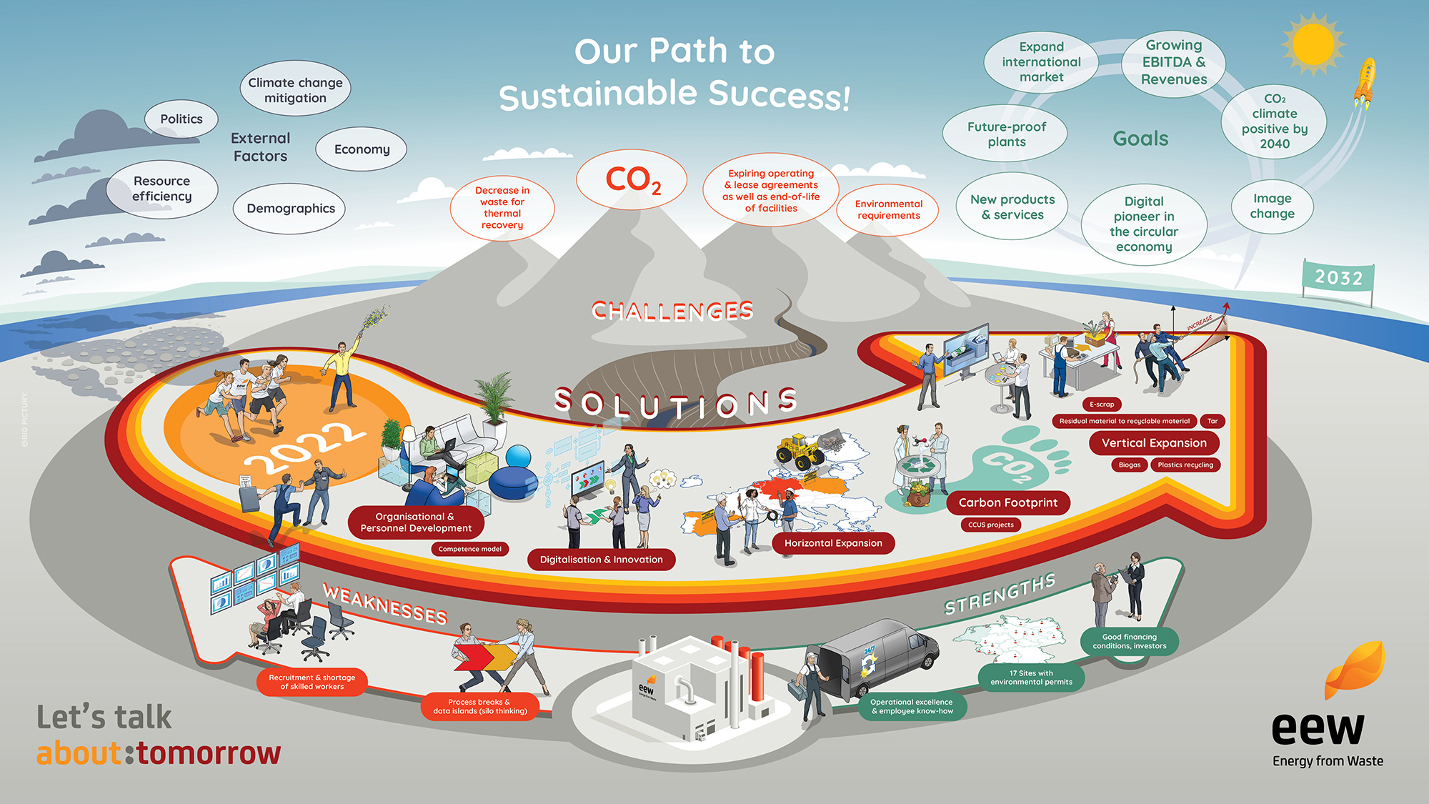 EEW Energy from Waste GmbH (EEW) is one of the leading companies in Europe in the field of thermal waste and sewage sludge recycling. And the company is aiming even higher: As part of its sustainability goals, EEW wants to be climate-neutral by 2030 and even climate-positive by 2040. To achieve this, the corporate strategy has been comprehensively realigned. A complex process that EEW now explains to its employees in a simple way with a big picture.