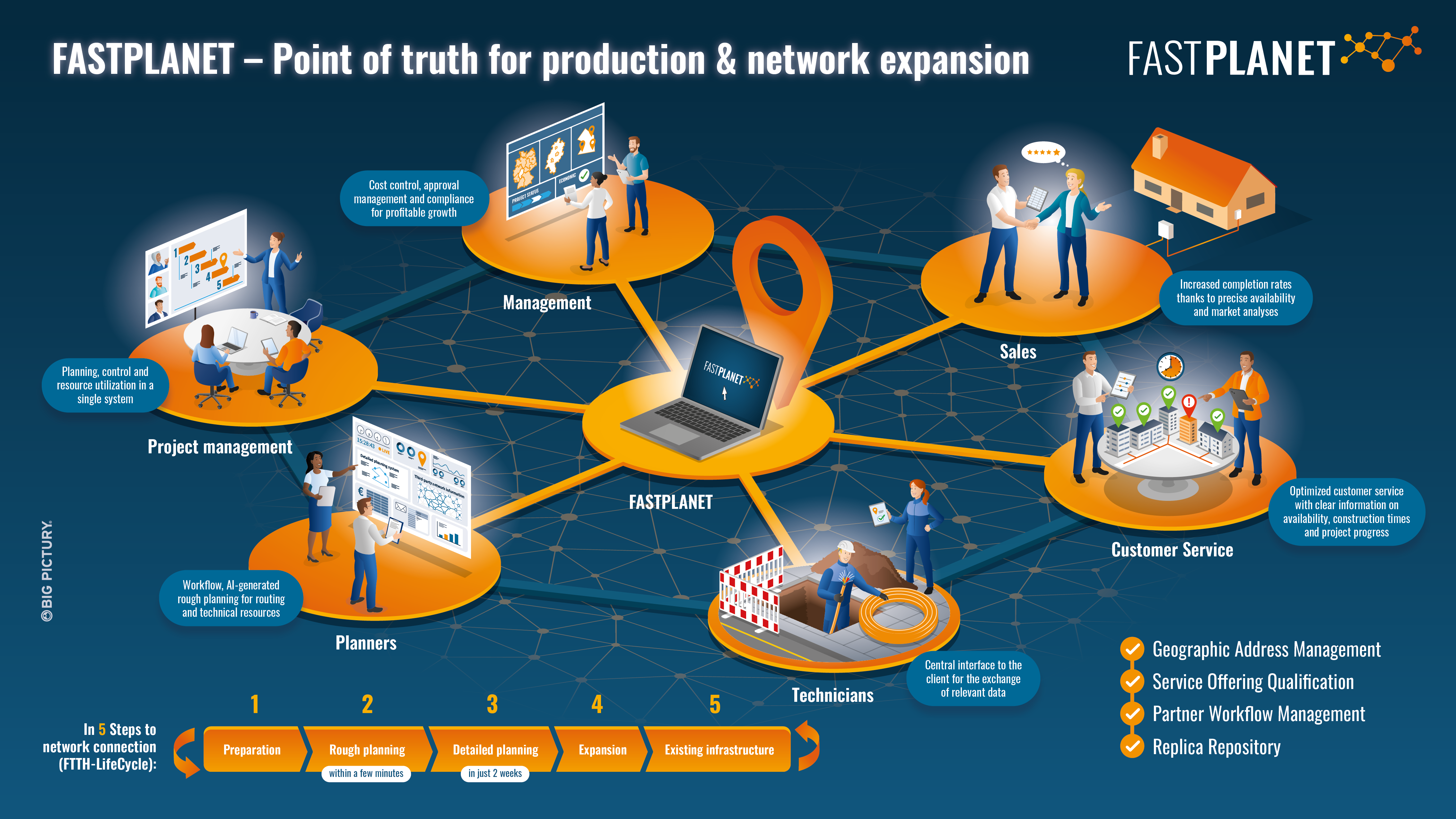 Together with FASTPLANET, we have developed a detailed big picture that depicts the company’s entire value chain in a clearly structured and easy-to-understand graphic. The picture shows the central processes of network expansion – from management and project planning to expansion and customer service – and illustrates how Fastplanet connects all the players as a “point of truth”.