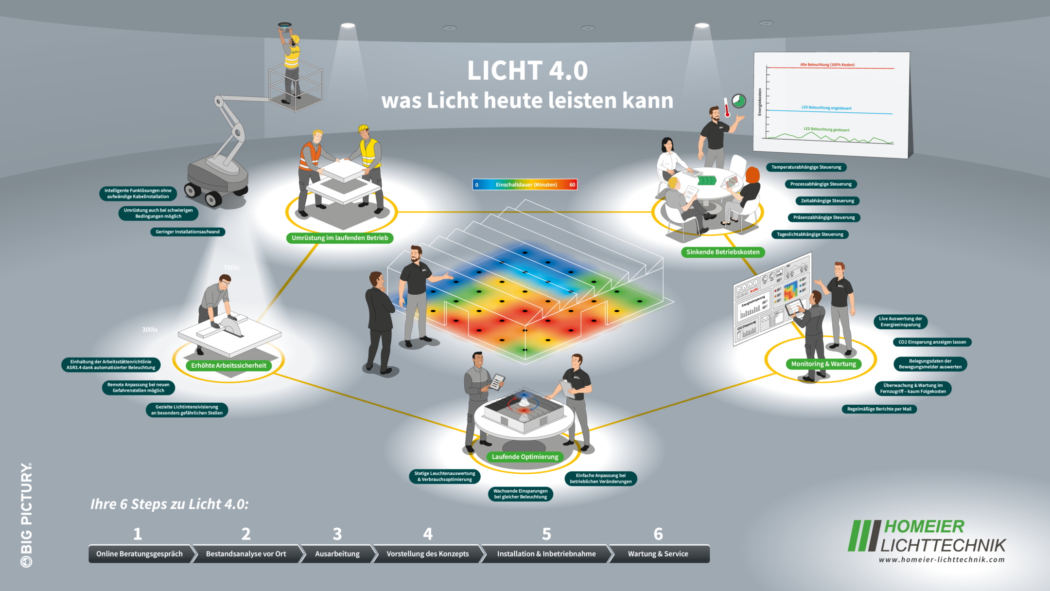 Homeier Solution GmbH & Co. KG is a leading company in the field of modern lighting solutions, specializing in smart, energy-efficient lighting systems for industrial and logistics environments. Homeier Solution’s solutions offer much more than just light: they reduce operating costs, increase occupational safety and can be seamlessly integrated into existing operating processes. The Big Picture, developed by Big Pictury, provides a vivid illustration of Light 4.0 technology and shows its specific benefits – a valuable tool for the company’s sales strategy and customer communication.