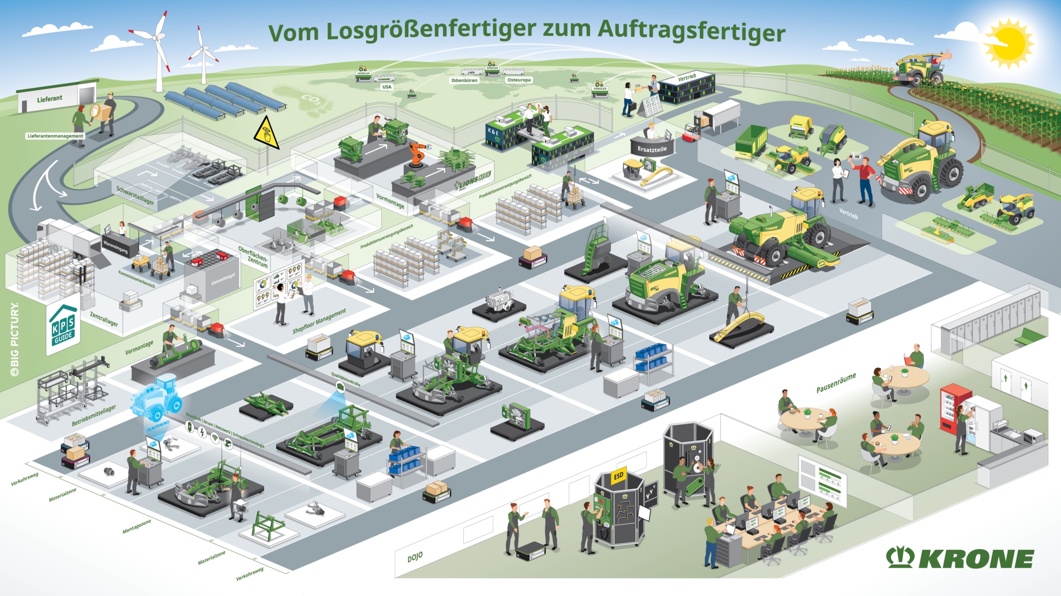 Big Pictury was commissioned to develop a visualization that makes the transformation of Krone’s production philosophy understandable and tangible. The aim was to vividly illustrate the change from a classic batch size manufacturer to a flexible contract manufacturer. The illustration should not only clarify the individual process steps and changes in the production process, but also convey the underlying principles of the new production strategy. This gives employees and partners a clear picture of how production processes can be optimized and made more efficient.