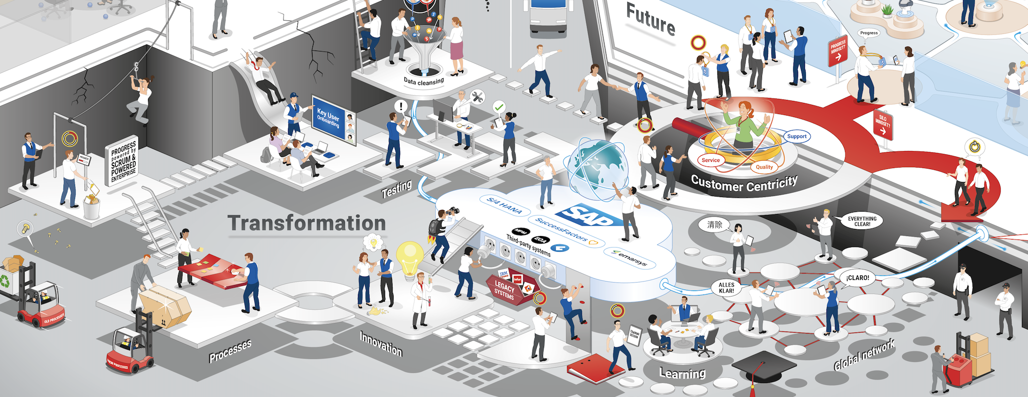 As part of a comprehensive change initiative, Big Pictury has developed a Big Picture for Messe Frankfurt that visualizes the transformation and the future of the company. This change measure, called Progress, aims to fundamentally renew Messe Frankfurt’s processes, systems and working methods. The Big Picture serves as a communication tool that takes all employees on the journey of transformation and gives them orientation and understanding of the upcoming changes.