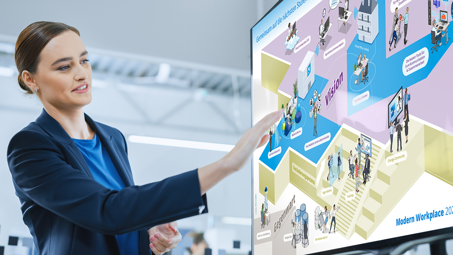 The collaboration between Die Techniker and Big Pictury was a multi-stage process. After a short but intensive briefing phase, the Big Pictury team captured the tasks and goals of the Modern Workplace project. A team from Big Pictury then conducted workshops with managers and other stakeholders relevant to change communication. In these workshops, the visual design of the cultural change in the company was elaborated and concretized with the help of a modular Big Picture Whiteboard version via Concepboard. Subsequently, a comprehensive and highly informative Big Picture as well as a digital Click-Picture (click version of the Big Picture for self-exploration) were generated for the employees. Die Techniker is currently integrating both elements into its internal communications in order to give employees an understanding of the changes taking place within the company and to generate enthusiasm among them. The Big Picture was received with great enthusiasm and quickly attracted the attention and interest of the workforce.