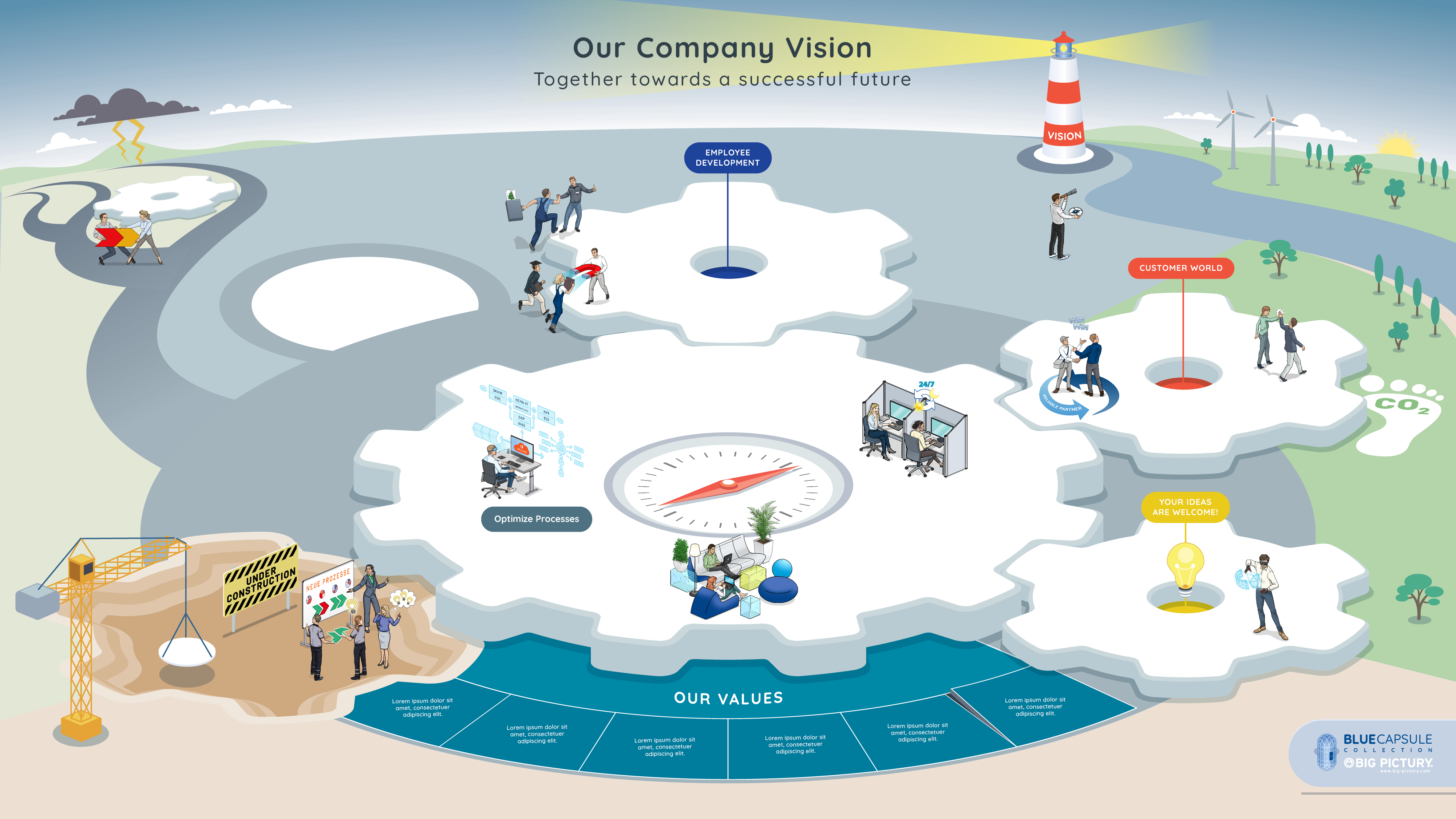 The main task of the desired Big Picture was not only to illustrate the change in the company to people from two companies (Salzgitter Digital Solutions GmbH and the parent company, Salzgitter AG), but also to inspire them to do the same. This was achieved by illustrating the transformation process through a path from the suboptimal initial situation to the new, effective “gearbox” (represented by several cogwheels). The Big Picture makes it clear in a simple and memorable way how this new “gearbox” with all its components (staff development, corporate strategy, customer orientation as well as the company’s value system) works, how it has developed and where the journey will lead in the future. The Big Picture was presented for the first time at the “Welcome Days”, to which all employees of the company were invited. Here, the Big Picture was received with great enthusiasm and quickly attracted the attention and interest of the staff.