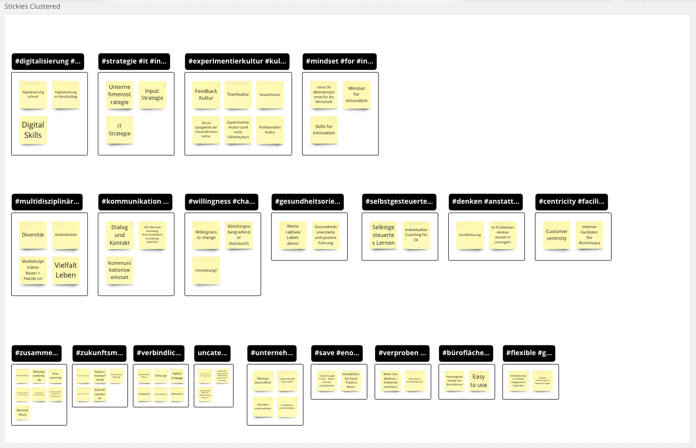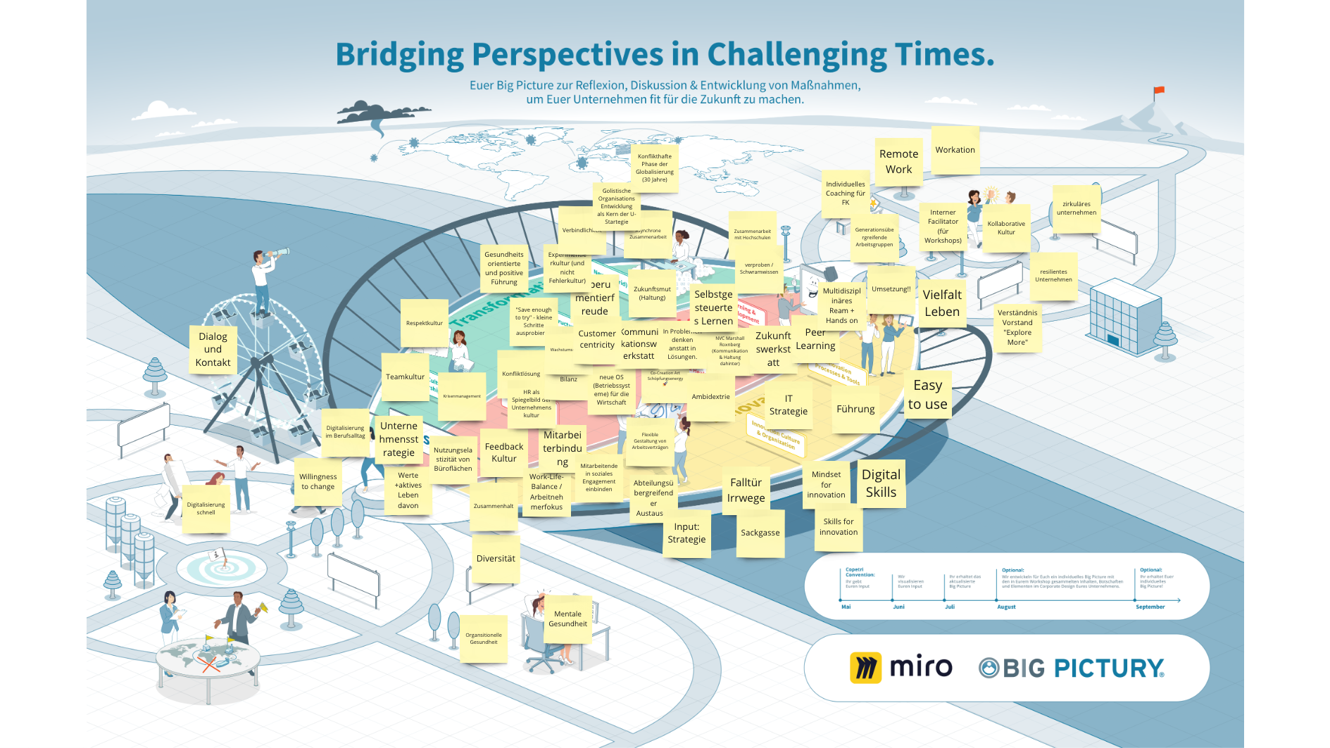 After the convention, we used Miro AI to digitalise and sort all the Post-Its. The picture was reorganised because too much content would reduce the effect of a Big Picture. The finished Big Picture shows the path of a company in transition, which is developing into a resilient, future-proof company by establishing various tools and methods.