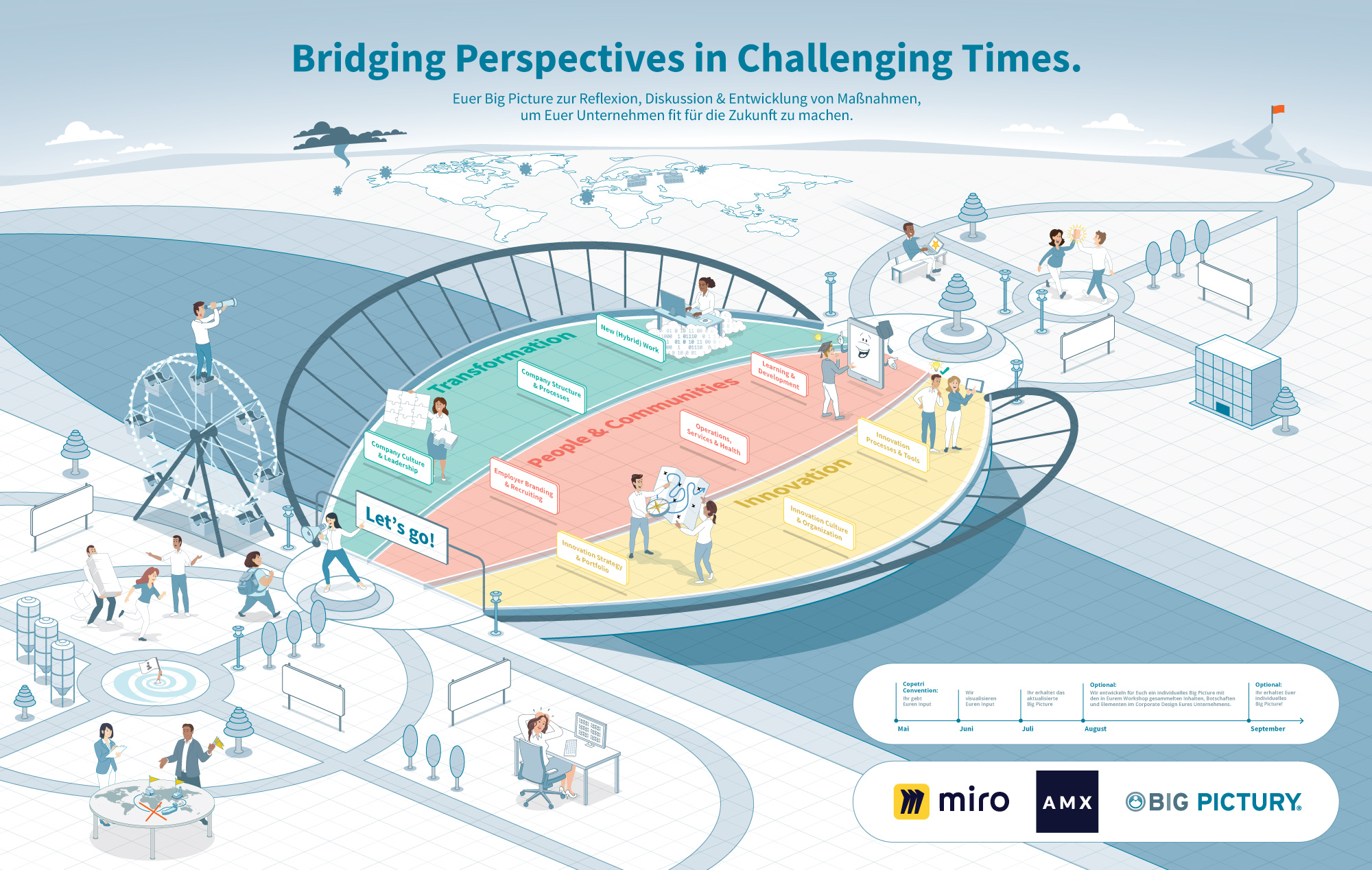 Together with AMX, we developed a Miro Board to match the Big Picture, which can be used even more interactively. In addition to the Big Picture, there are several stations with exercise and workshop areas where content can be collected and worked on with Post-its. You can also view the Miro Board without a Miro account here.