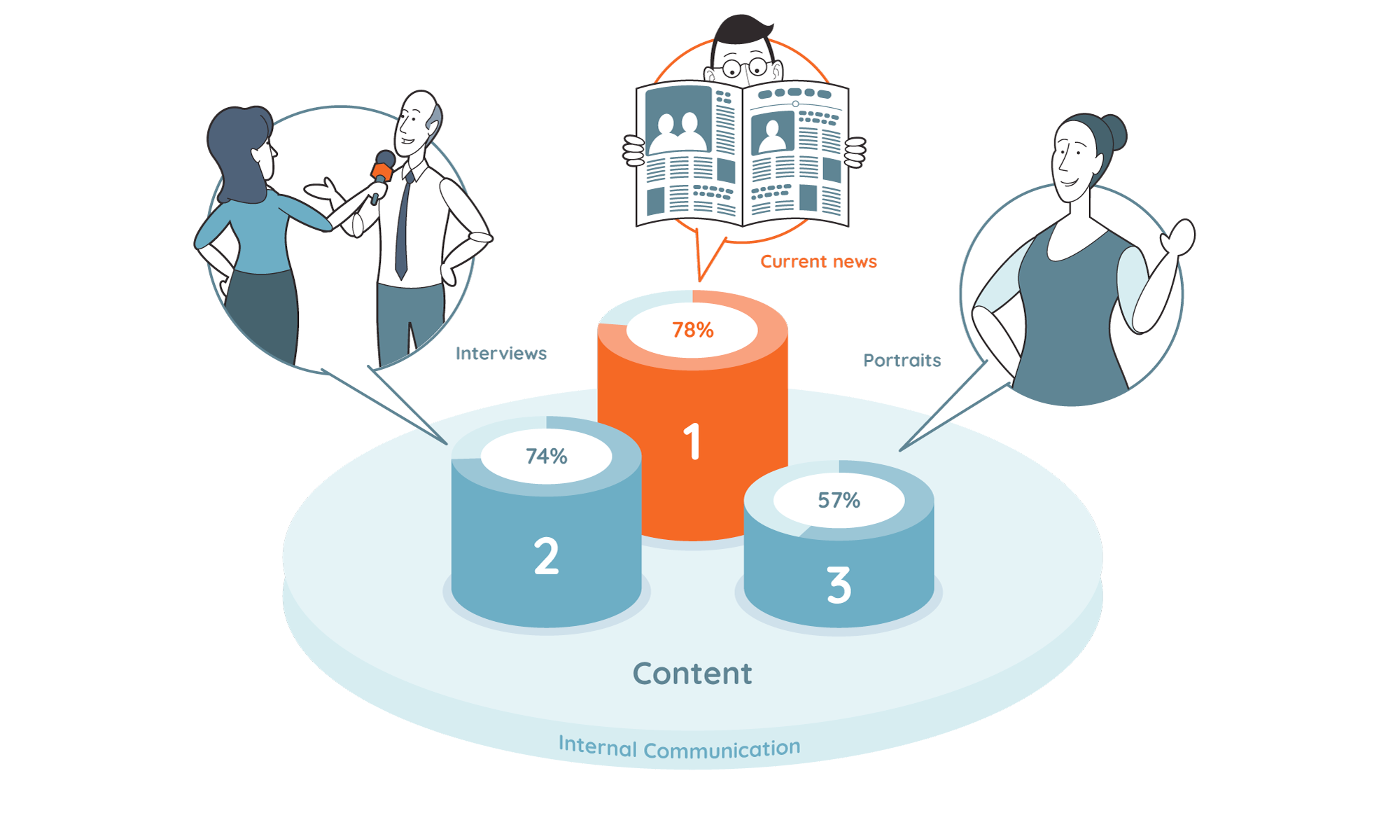 According to Trendmonitor, most companies focus on strategic content in their internal communication, i.e. on communicating values and a positive attitude (84.7%). Other key issues are human resources and change processes. Other trending issues are staff stories, innovation issues, content on everything to do with departments and locations, as well as service issues. This content is most often seen in current news (77.5 %) and interviews (73.9 %). Portraits are also popular (56.6 %). However, infographics and dialogue pictures, podcasts, quizzes and games are also gaining in popularity because they are well-suited to conveying complex ideas in a simple and entertaining way.