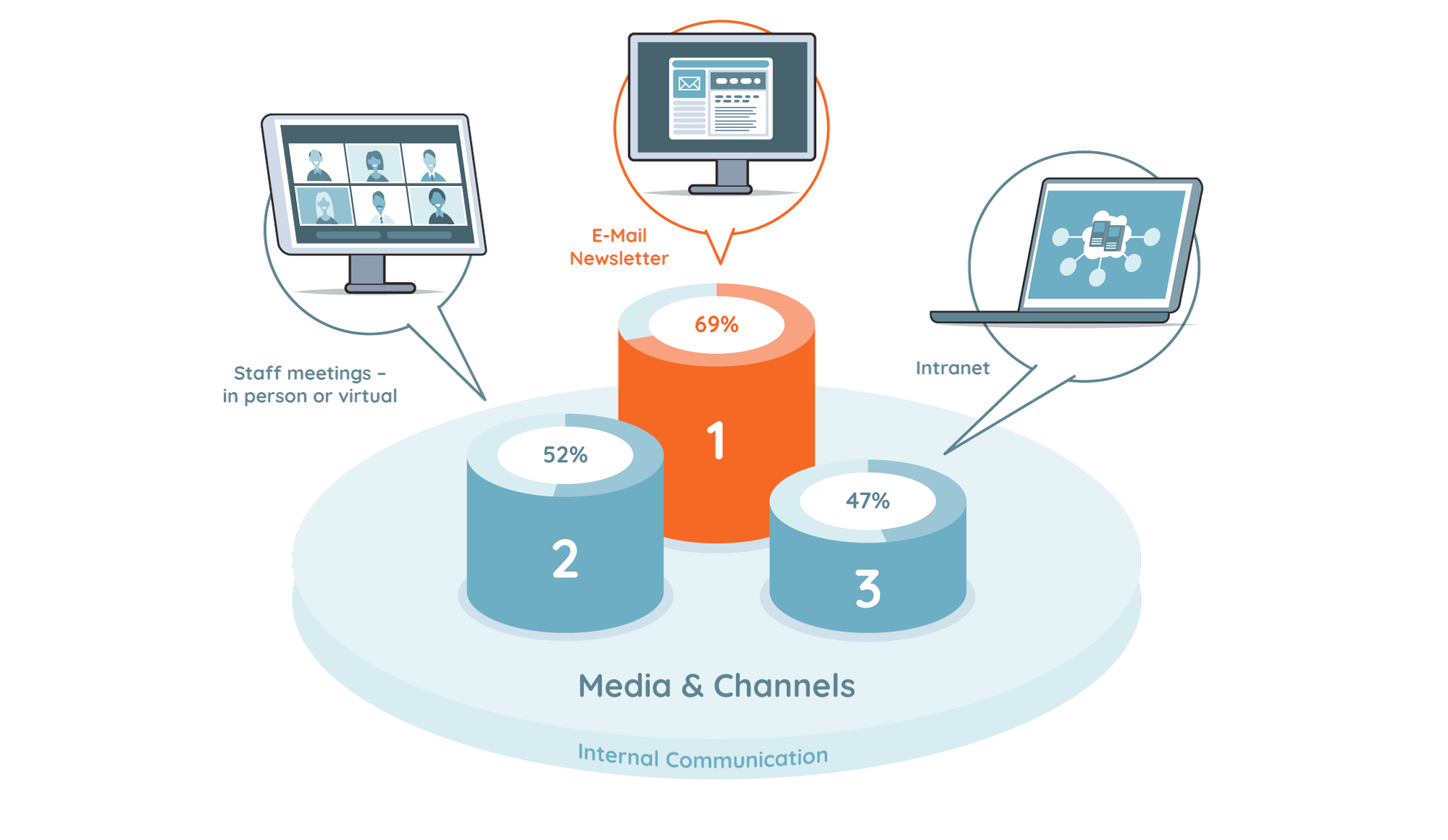 A survey by the Berlin-based opinion and market research company Civey showed that despite the digitalisation push, emails and email newsletters are still the most frequently used channel for reaching employees (69%). In second place is an equally traditional tool: the staff meeting – held in person or virtually (52 %), while the Intranet (47 %) only comes in in third place. According to Trendmonitor, staff apps are also increasingly in demand: 18.2 percent of the companies surveyed plan to introduce their own app for their staff in the near future. Podcasts and social Intranets are also becoming increasingly popular (+13.6% and +8.3% respectively).