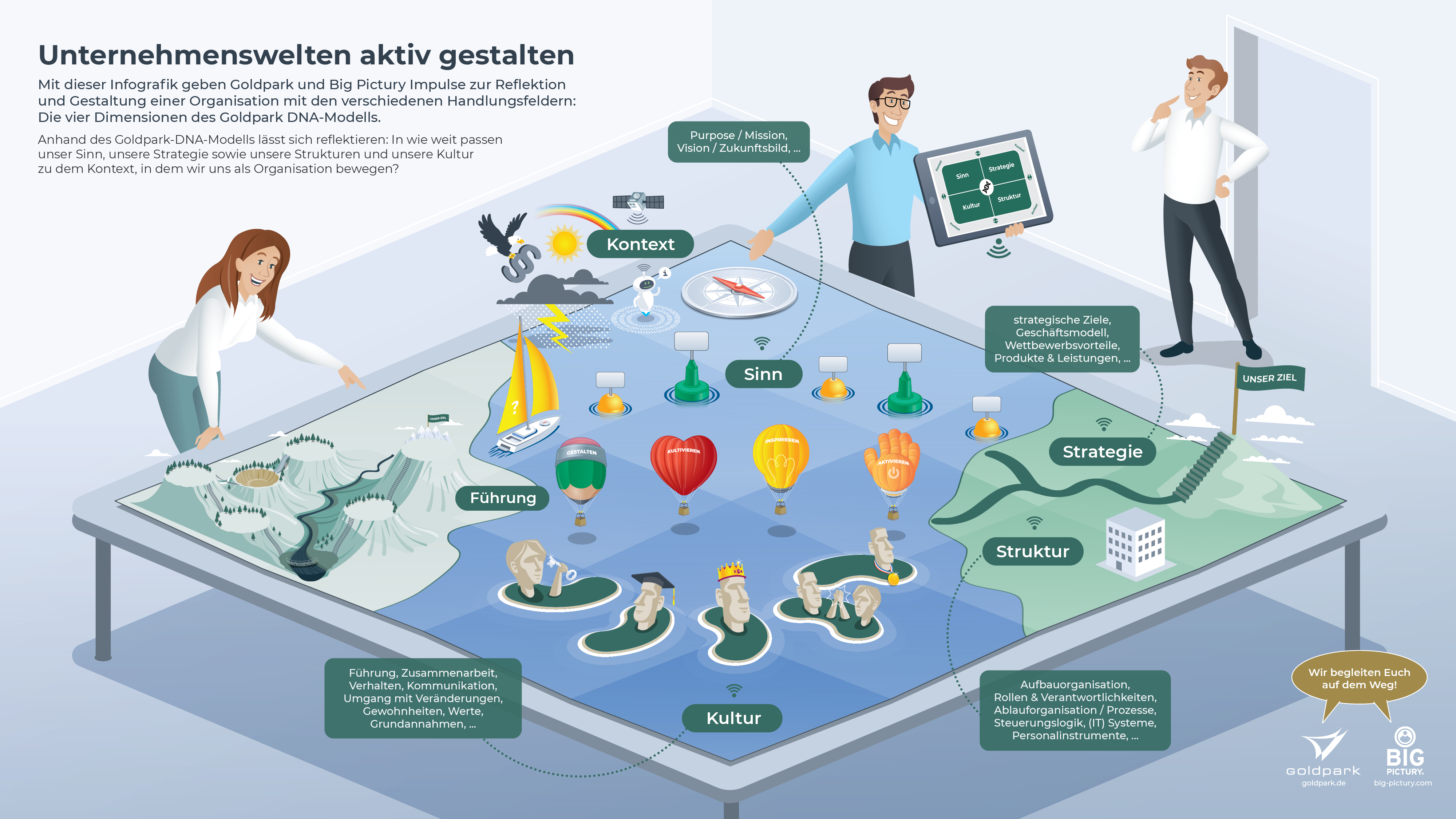 The consultants at Goldpark AG will help you set up your organisation with foresight. They will be happy to support you with questions relating to purpose, strategy, structures and culture, contributing their expertise with the Goldpark DNA model.