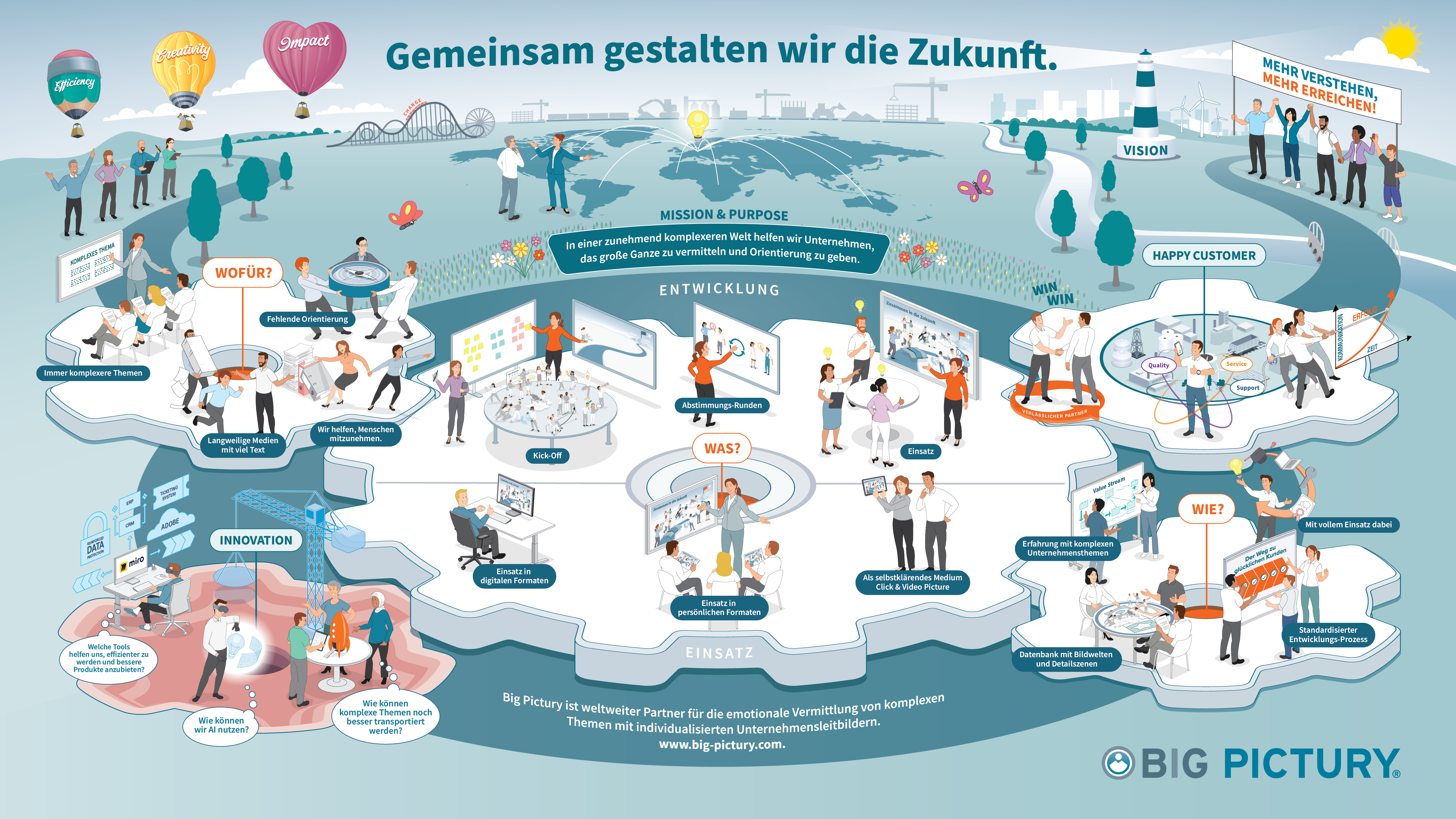 Big Pictury macht komplexe Themen verständlich – mit einzigartigen Big Pictures, die Zusammenhänge auf einen Blick erkennbar machen. Wir unterstützen Unternehmen dabei, Visionen, Prozesse und Veränderungen anschaulich zu kommunizieren – ob digital oder analog.
