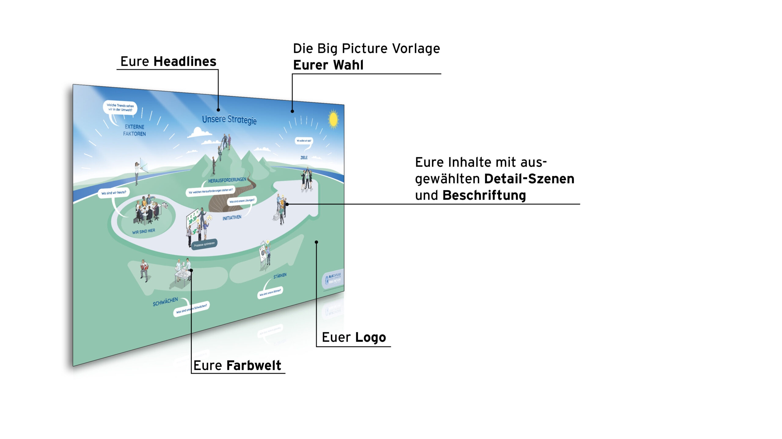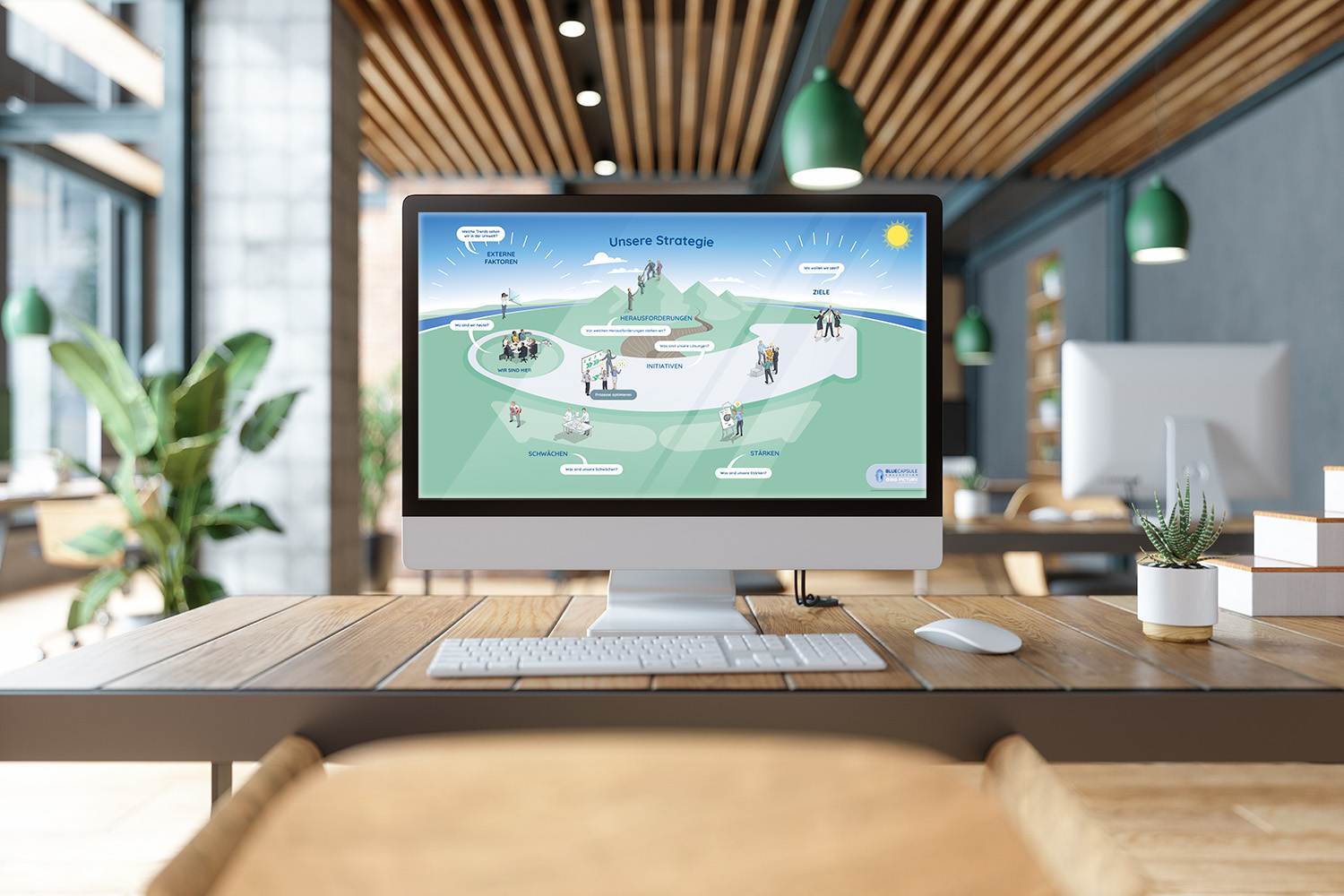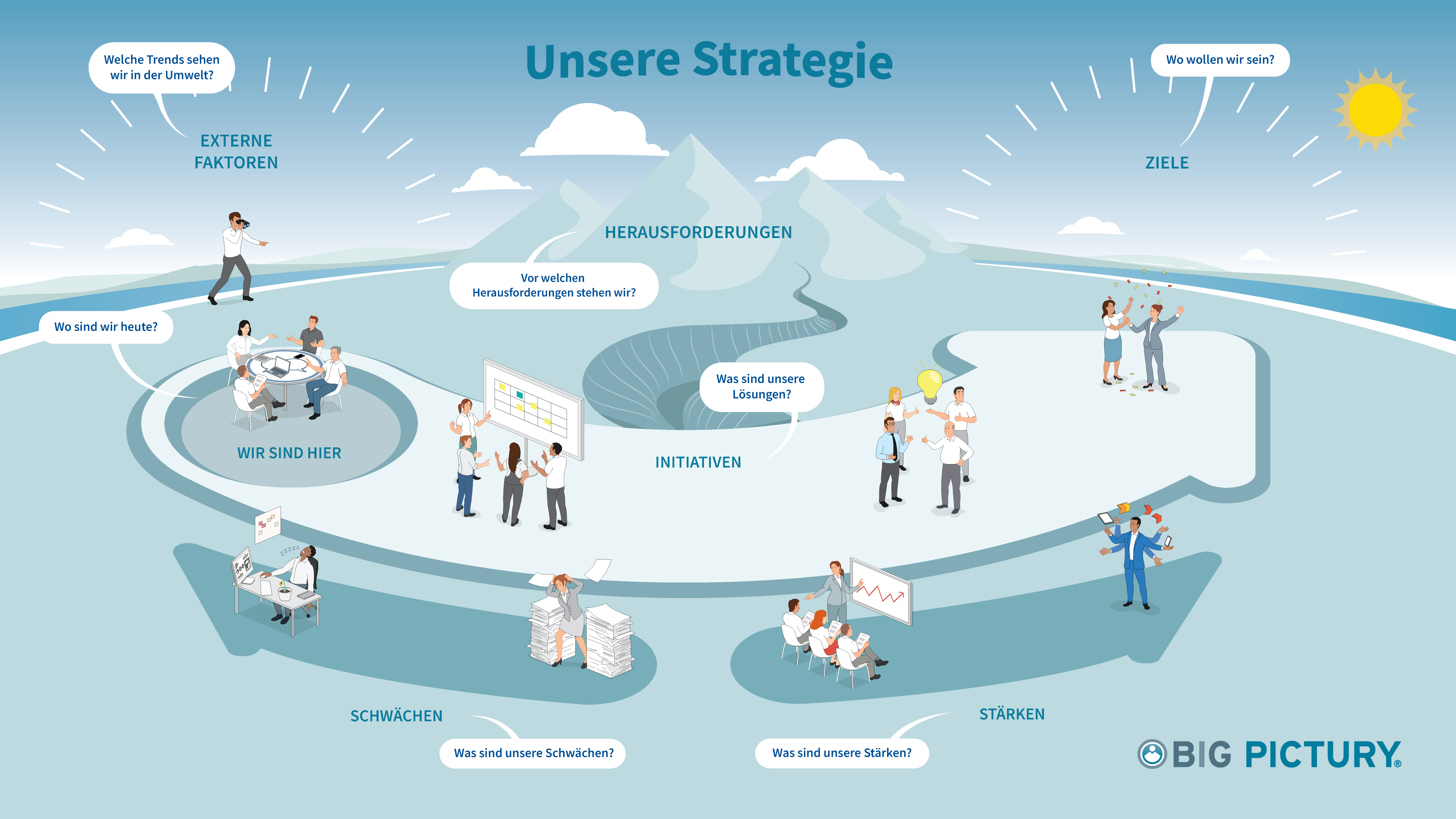 Strategievisualisierungen erleichtern es den Führungskräften, den Mitarbeitern wichtige Themen zu vermitteln, wie z. B. den aktuellen Stand des Unternehmens, die Ziele und die künftige Ausrichtung des Unternehmens, sowie die Stärken und Schwächen aufzuzeigen, die das Unternehmen bei der Erreichung des gewünschten Zustands unterstützen oder behindern.