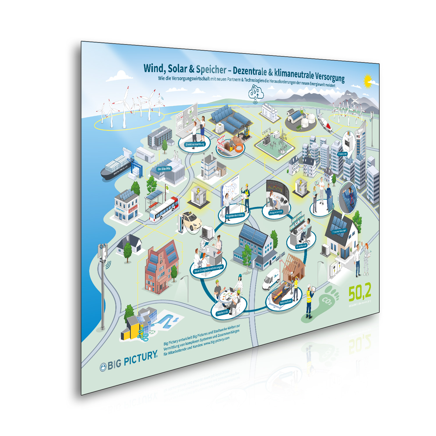 Transparente Kommunikation hilft dabei, Vertrauen zu schaffen und Orientierung zu geben. Mit diesem Big Picture könnt Ihr Euren Kunden, Mitarbeitenden und Partnern auf plakative Weise vermitteln, wie Eure „Energiewende Roadmap“ aussieht.