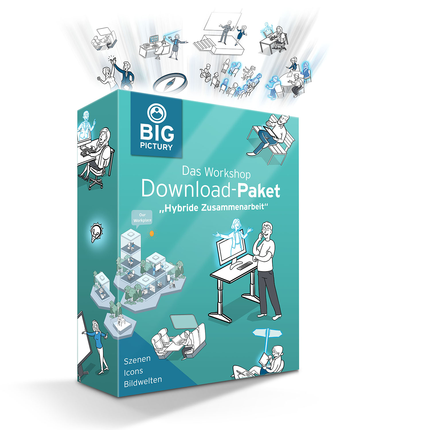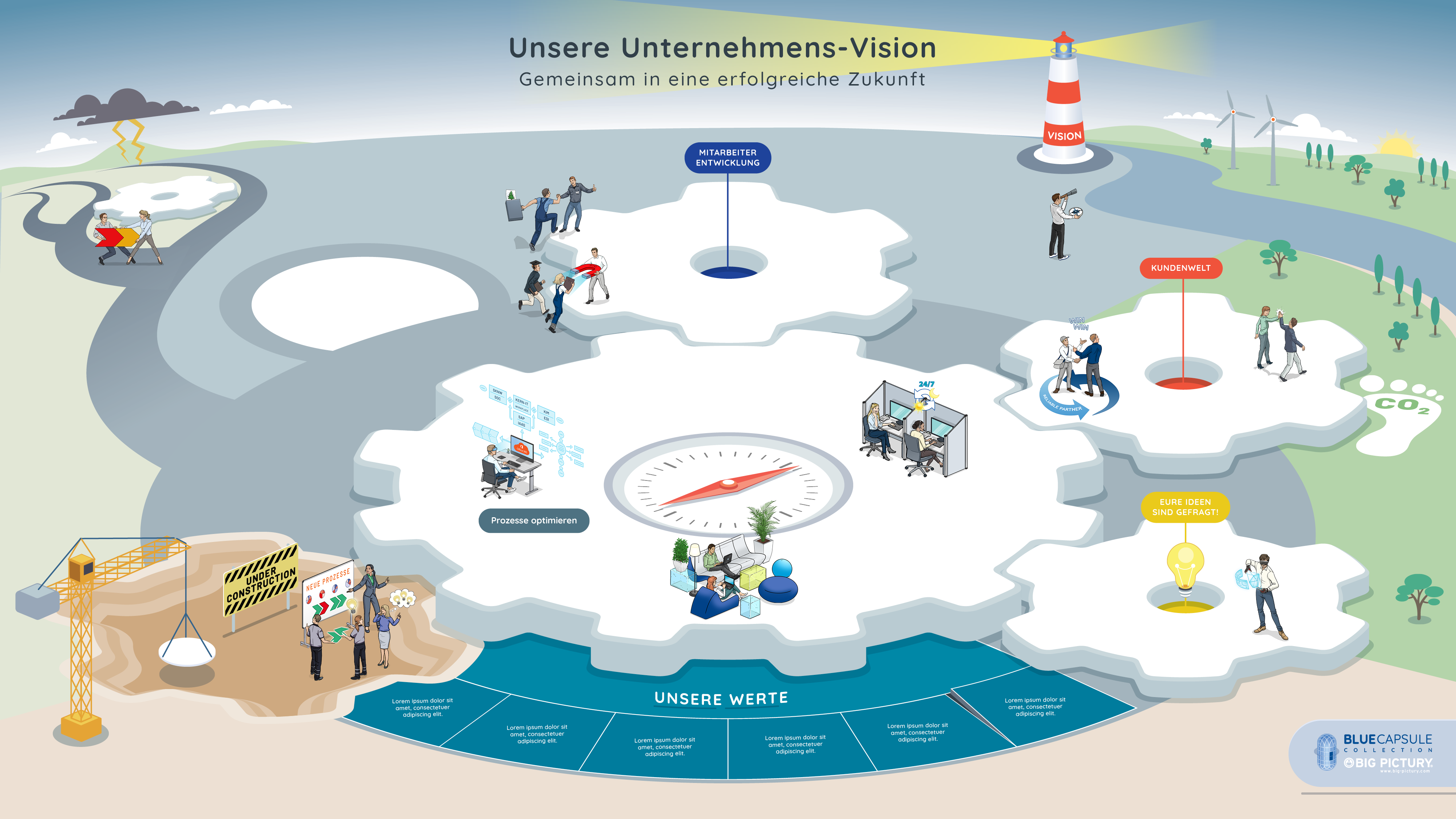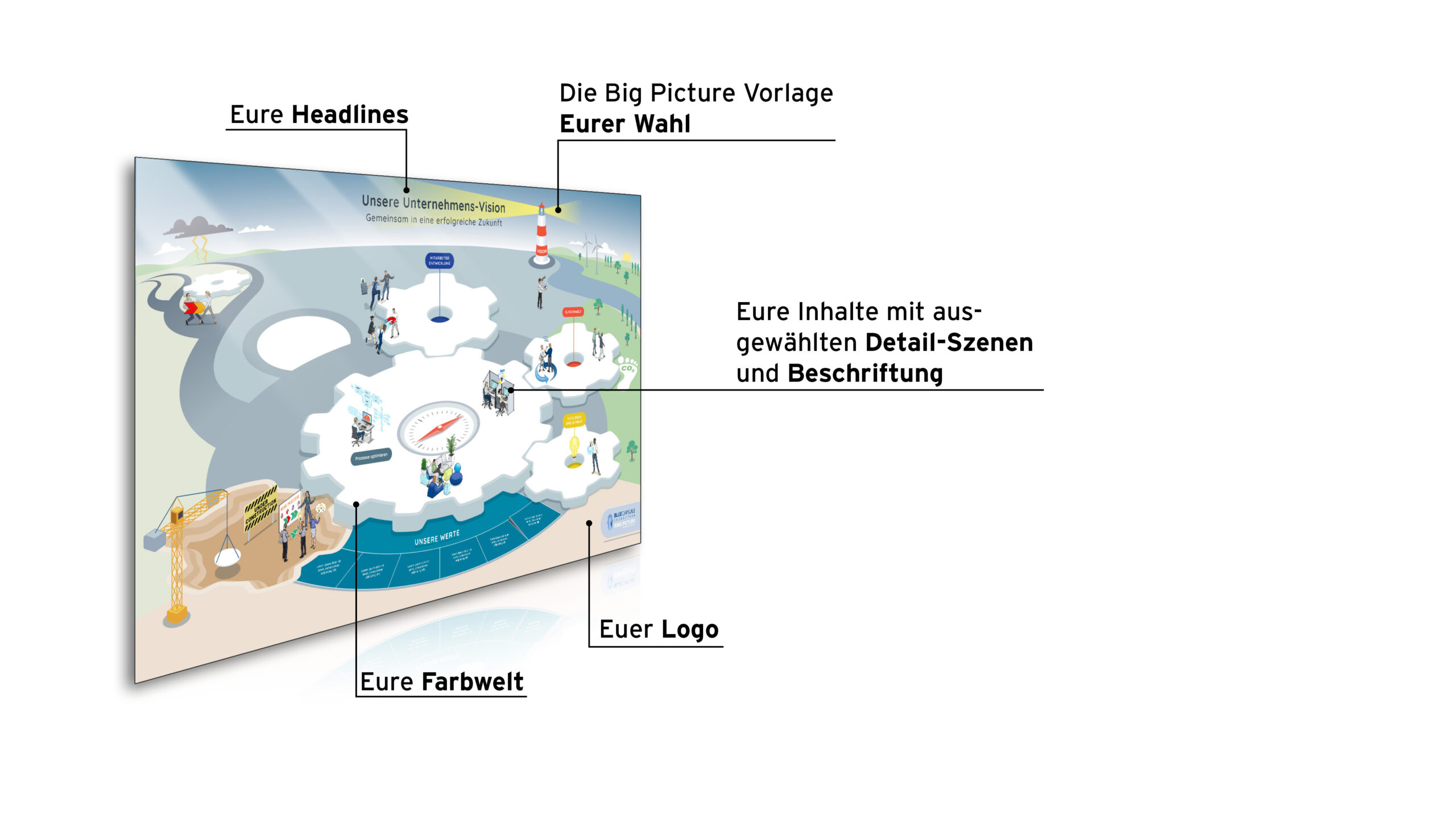 Das Big Picture „Unsere Unternehmensvision“ hilft Führungskräften, ihren Mitarbeitenden die Unternehmensvision zu vermitteln, einschließlich der Unternehmensgeschichte, der Vision und der Mission, der systemischen Veränderungen, der Onboarding-Prozesse, der Werte, der Kundenwelt, neuer Entwicklungen und Herausforderungen im Veränderungsprozess.