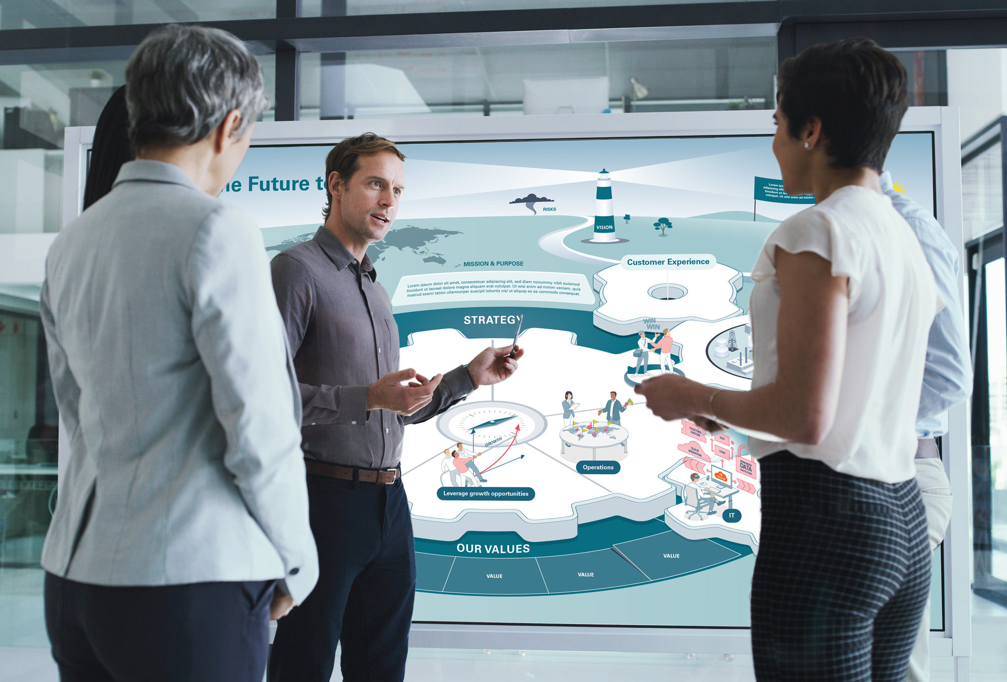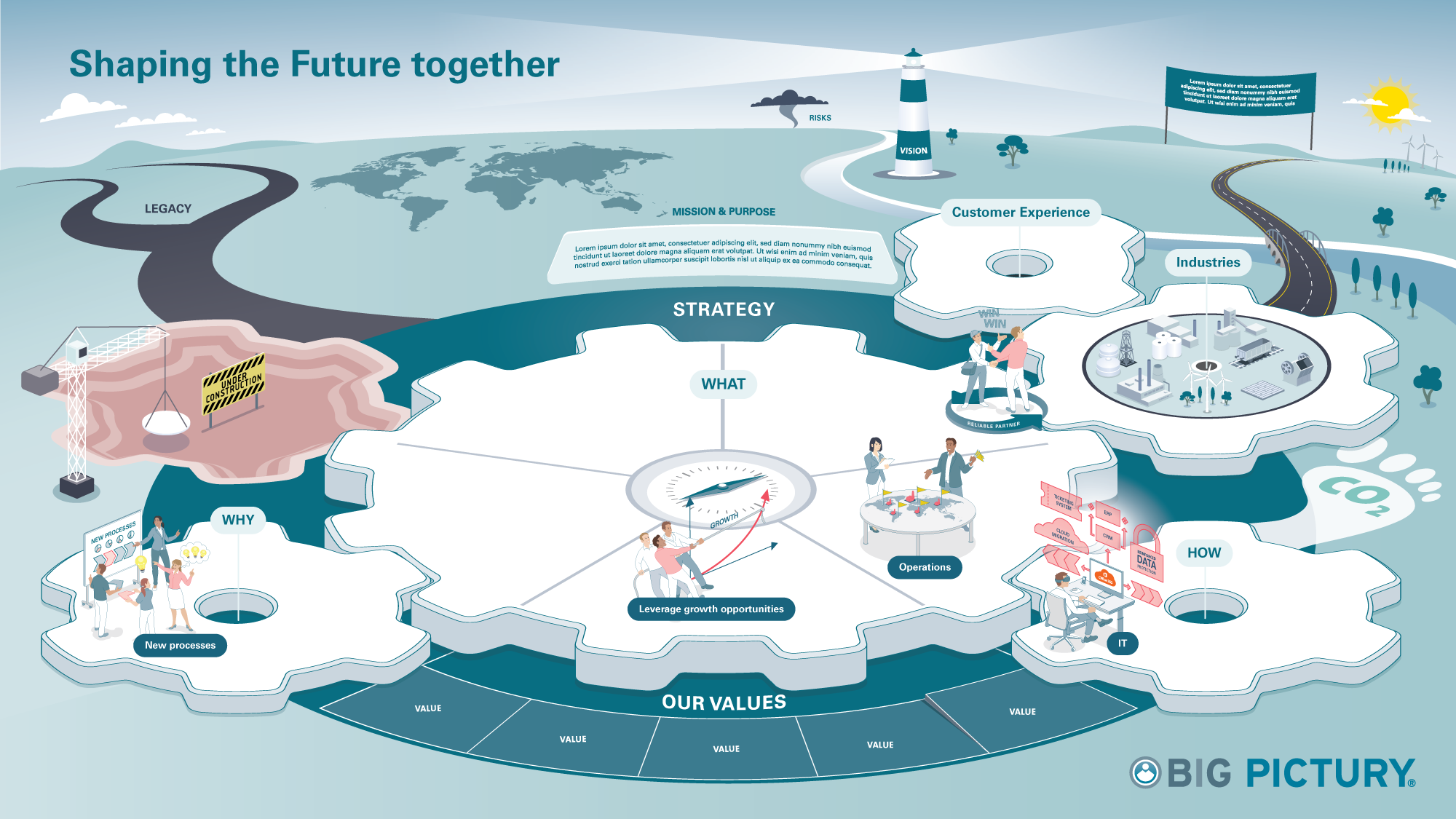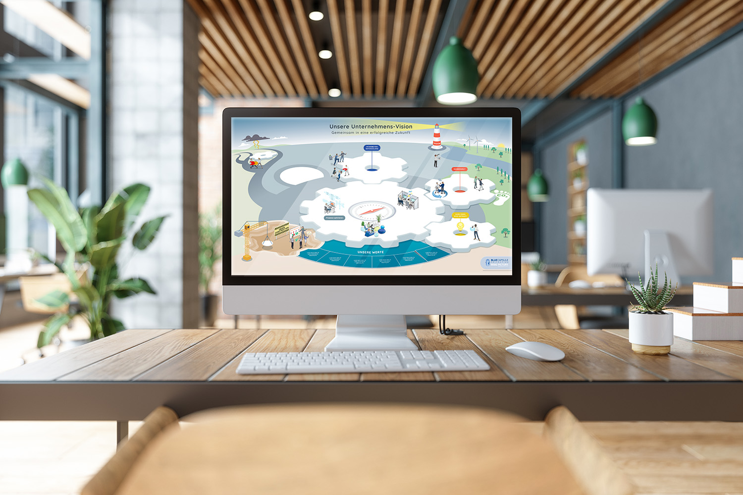 Das Big Picture „Unsere Unternehmensvision“ hilft Führungskräften, ihren Mitarbeitenden die Unternehmensvision zu vermitteln, einschließlich der Unternehmensgeschichte, der Vision und der Mission, der systemischen Veränderungen, der Onboarding-Prozesse, der Werte, der Kundenwelt, neuer Entwicklungen und Herausforderungen im Veränderungsprozess.