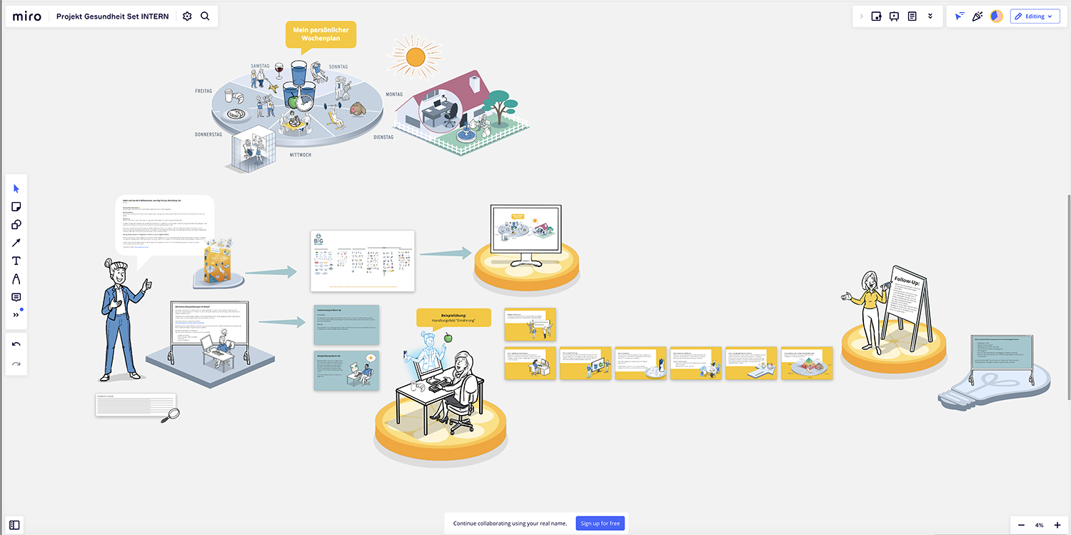 Mit dem Workshop Set gelingt das Einbinden von Vorträgen zu verschiedenen Themen aus dem betrieblichen Gesundheitsmanagement in visuell „anpackbare“ Sprache. Die Teilnehmenden bauen ihre Interpretation des Vortrages live mit oder konzipieren neue Ideen für Gesundheitskonzepte der Organisation oder erstellen ihren eigenen Gesundheitsplan zum digitalen Mitnehmen oder Ausdrucken. Menschen, die sich visuell und aktiv mit Themen auseinandersetzen kommen besser und häufiger in die Umsetzung. Regelmäßige Follow Ups unterstützen zudem in Routinen und die Trainer haben ein ideales Ausgangsmaterial für Ihre Fragestellungen für virtuelle Räume.