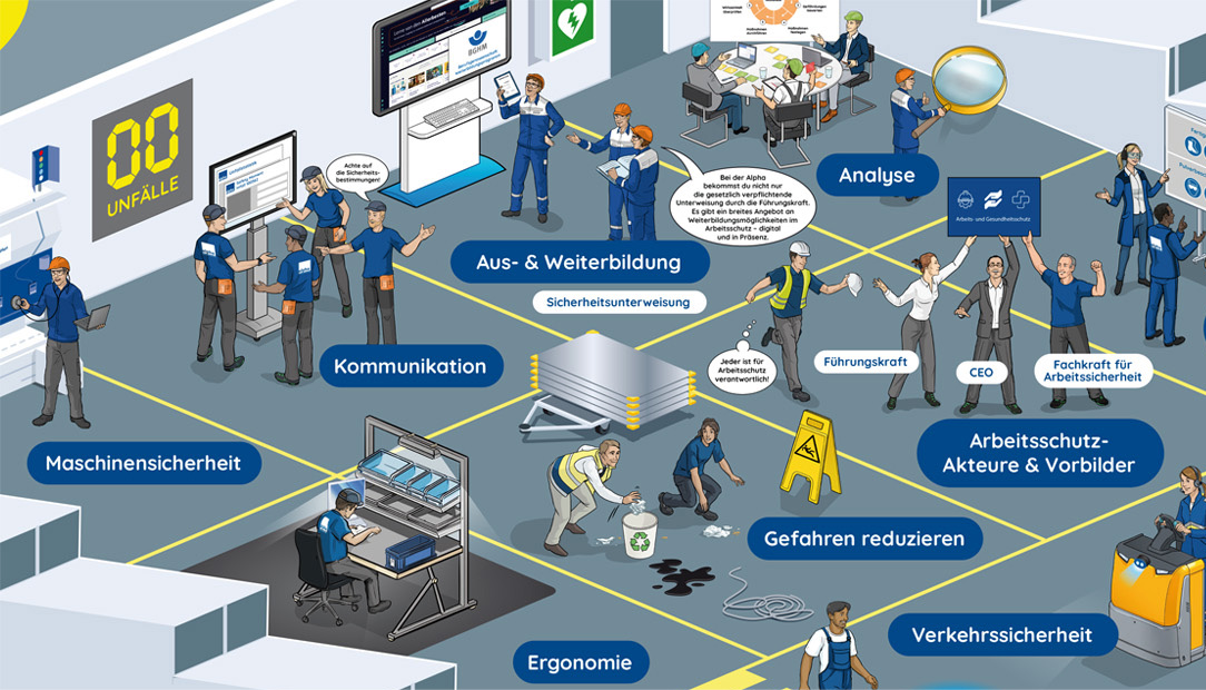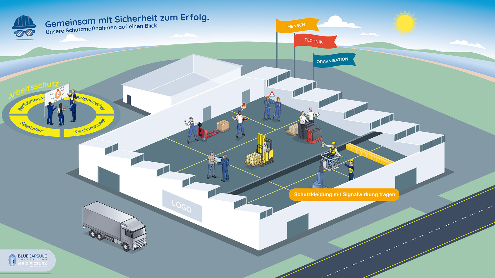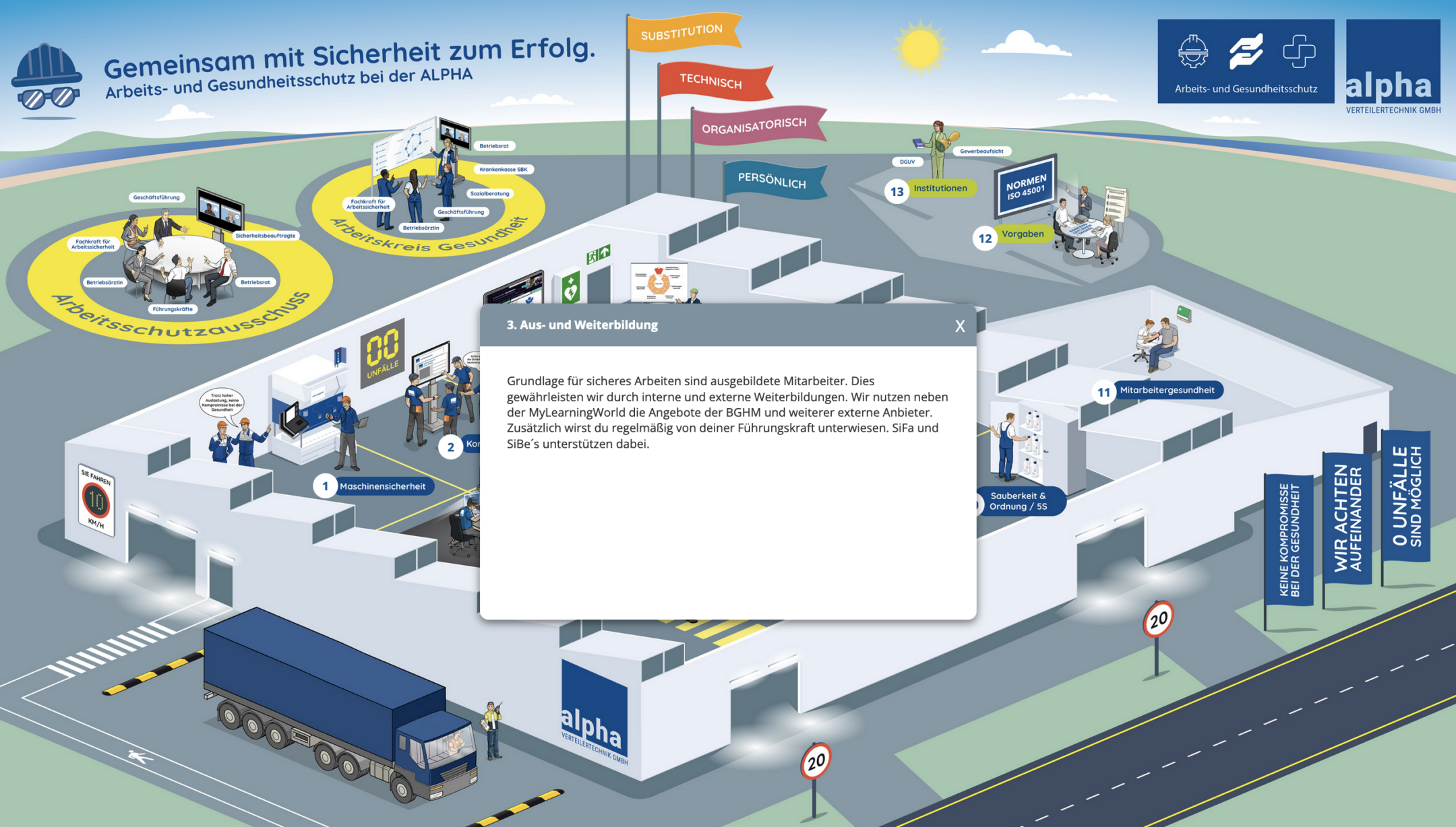 In enger Abstimmung mit der ALPHA Verteilertechnik GmbH erstellte BIG PICTURY binnen kürzester Zeit (Arbeitsaufwand auf Kundenseite: 2 Tage) ein passgenaues Big Picture zum Thema „Arbeits- und Gesundheitsschutz“. Visualisiert wurden nicht nur die wichtigsten unternehmensspezifischen Abläufe, potenzielle Gefahren und Schutzvorkehrungen im Produktions- und Logistikbereich, sondern auch weitere arbeitsschutzrelevante Themen aus dem Büro- und Organisationsbereich. Darüber hinaus wurden auch externe Faktoren des Arbeitsschutzes (wie z. B gesetzliche und berufsgenossenschaftliche Vorgaben) schnell und einfach verständlich visualisiert. In der digitalen Variante als ClickPicture wurde das Big Picture mit zusätzlichen Klickpunkten versehen, die sich öffnen, sobald der Betrachter auf den gewünschten Bereich klickt. Die hinter den Punkten liegenden Textfelder beinhalten weitere Informationen zu den einzelnen Themenbereichen.