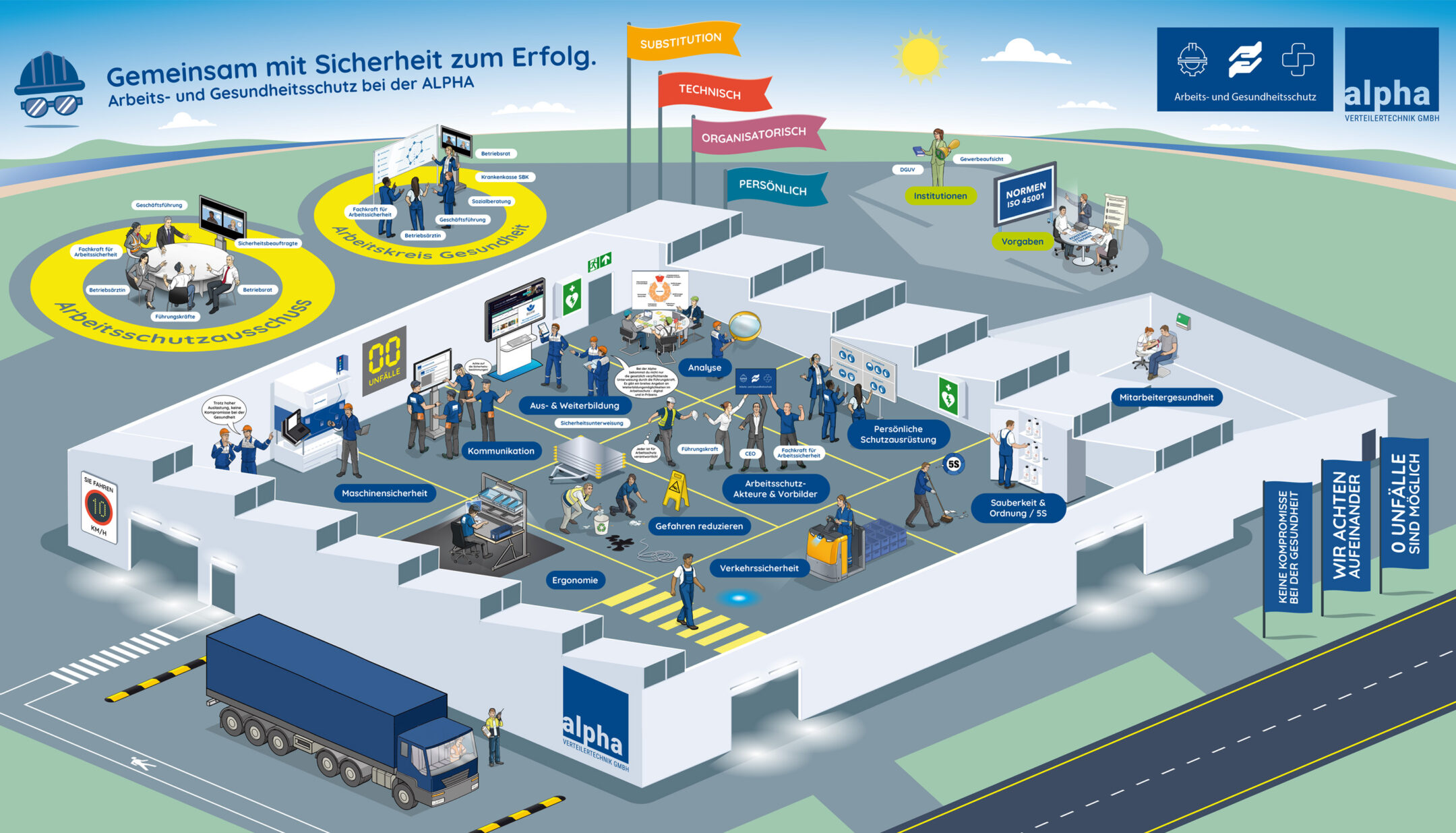 Genau wie jedes andere Unternehmen in Deutschland auch ist die ALPHA Verteilertechnik GmbH für den Arbeitsschutz in ihrem Betrieb verantwortlich. Das Unternehmen kommt dieser Pflicht seit jeher gewissenhaft und umfassend nach und hat dabei eine wichtige Erkenntnis gewonnen: Kommunikation ist ein wesentliches Element zur Schaffung eines hohen Sicherheitsbewusstseins und zur Verbesserung der Sicherheitskultur. Aus diesem Grund hat sich die ALPHA Verteilertechnik GmbH dazu entschieden, ein Big Picture zu entwickeln, das die wichtigsten Aspekte des Arbeitsschutzes im Unternehmen bildlich auf den Punkt bringt.