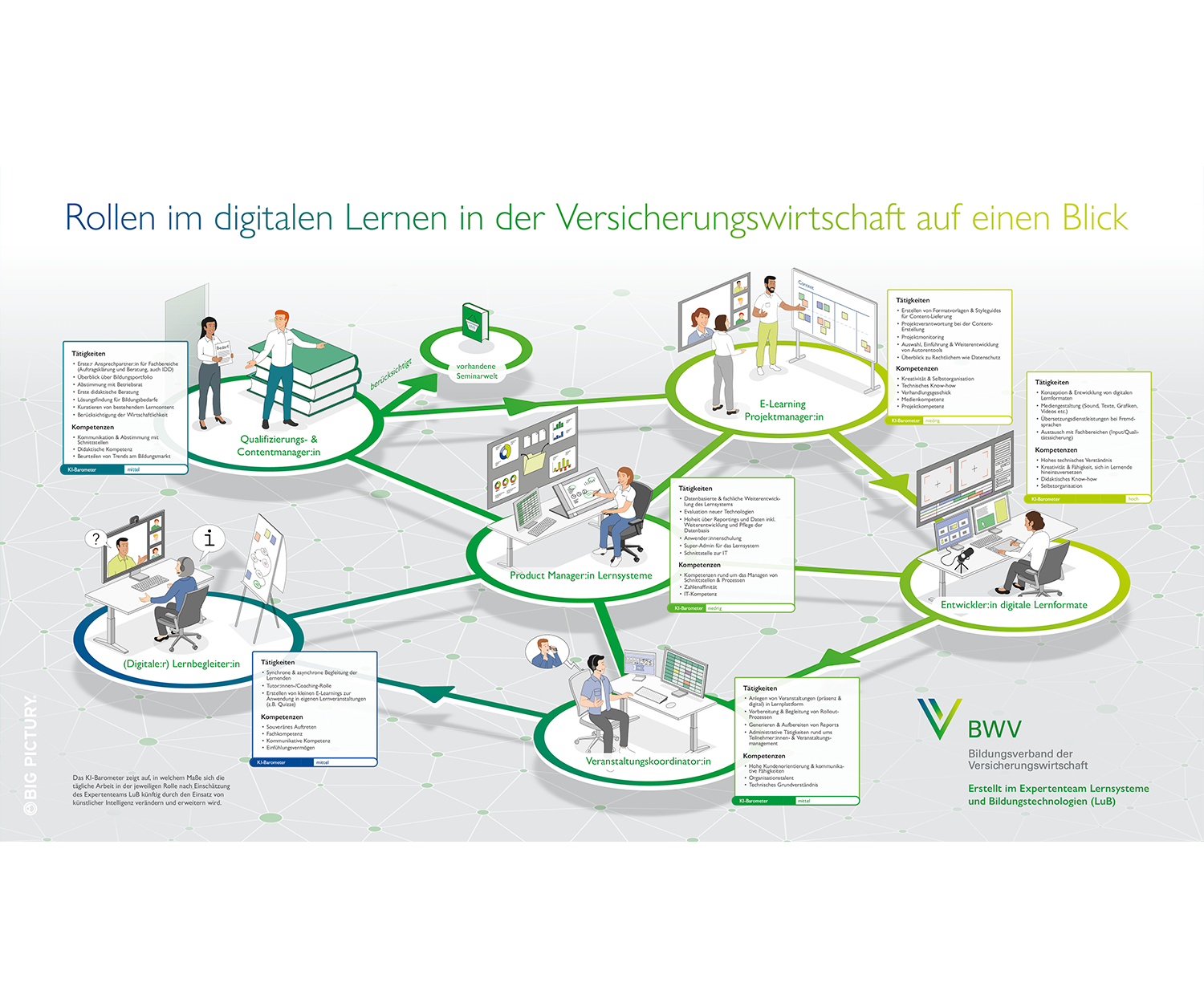 Das Expertenteam Lernsysteme und Bildungstechnologien (LuB) des BWV Bildungsverbands hatte ein textbasiertes Konzept zu Aufgabenfeldern und Rollen im E-Learning entwickelt. Um die Inhalte übersichtlicher und ansprechender darzustellen sowie eine weitere Verbreitung zu ermöglichen, wurde entschieden, diese mit einem Big Picture zu visualisieren.