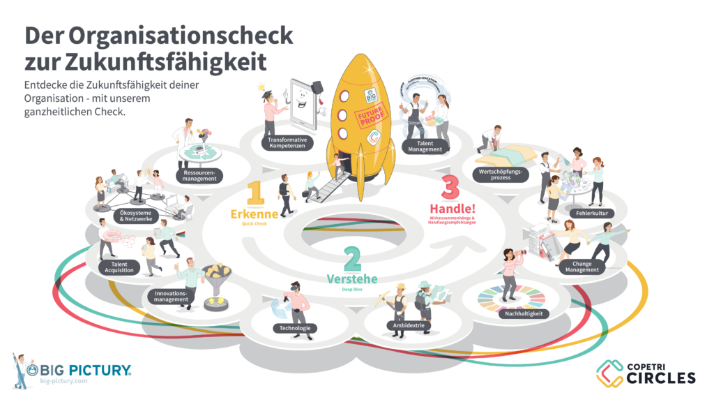 In diesem Circle geht es um die Frage, wie Unternehmen aufgestellt sein müssen, um Veränderungen erfolgreich zu realisieren – Future Proven. Der Schlüssel ist ein ganzheitliches Unternehmenscheck, der die Bereiche People, Transformation und Innovation in einem gemeinsamen Kontext betrachtet. Im ersten Zyklus wurde die IST-Analyse entwickelt und verprobt. Im zweiten Zyklus geht es im Schwerpunkt um die Gestaltung des SOLL-Zustandes inklusive der Ableitung konkreter Handlungsempfehlungen. Diese Ergebnisse sind nun in einem Bild veranschaulicht.