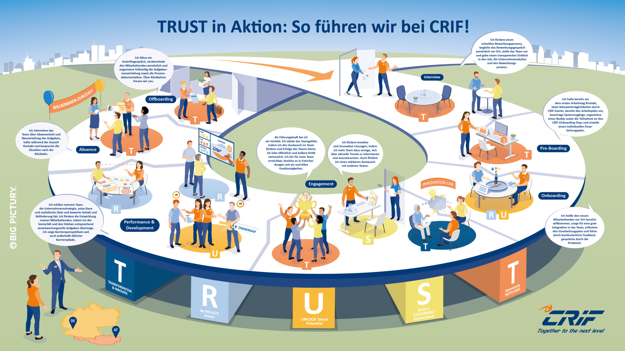 Zur erfolgreichen Umsetzung des neuen Leadership-Modells wurde ein Workshop mit Führungskräften aus Deutschland und Österreich durchgeführt, um gemeinsam den Inhalt des „Big Pictures“ zu erarbeiten. Auf Basis der Workshop-Ergebnisse und eines Briefing-Gesprächs mit den Kreativen von Big Pictury wurde das Big Picture entwickelt. Ein besonderer Augenmerk lag dabei auch auf der Umsetzung der Corporate Design-Vorgaben des Headquarters, die auch den Illustrationsstil vorgeben. Dieser wurde von Big Picturys Illustrationsabteilung problemlos adaptiert.