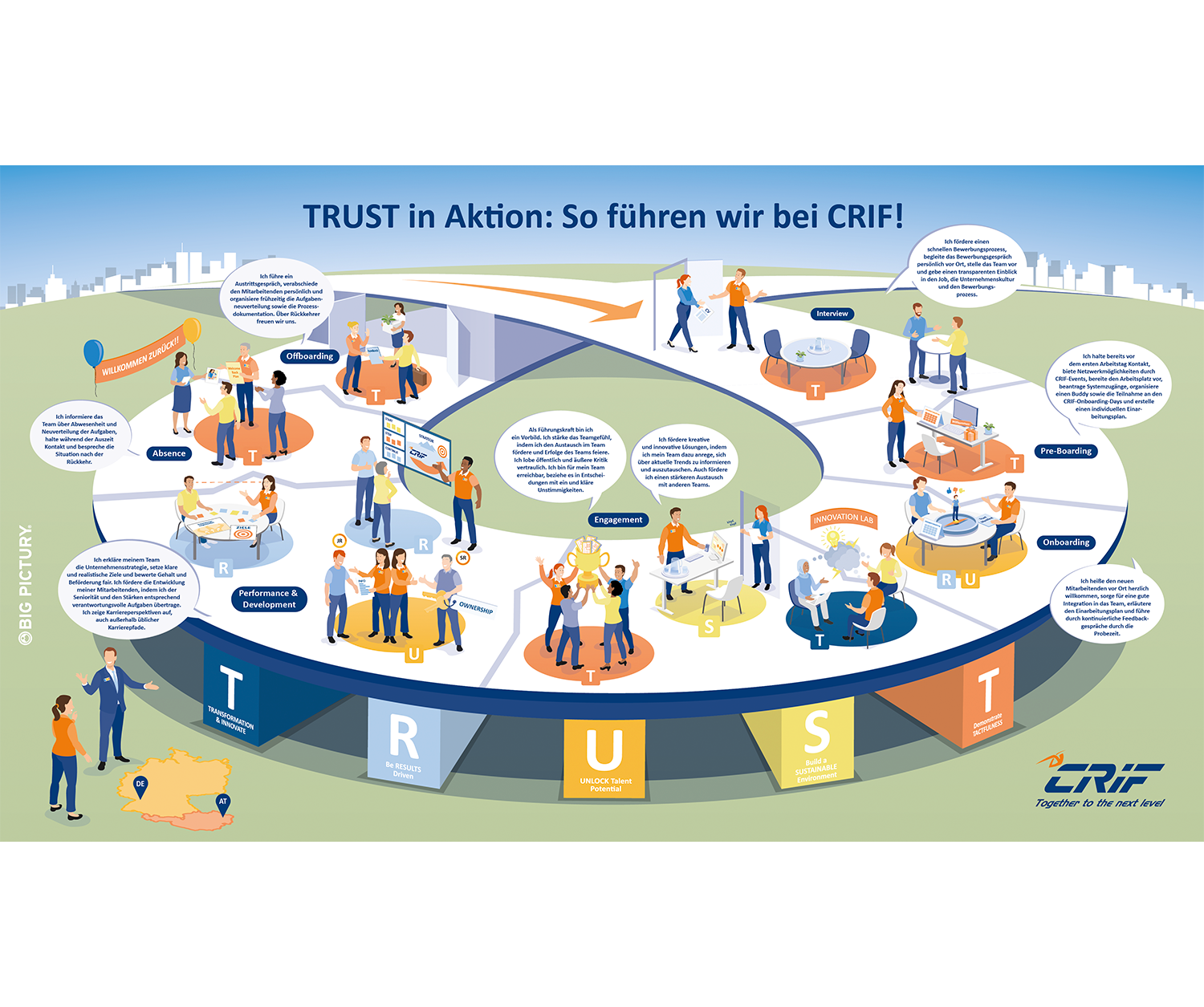 Zur erfolgreichen Umsetzung des neuen Leadership-Modells wurde ein Workshop mit Führungskräften aus Deutschland und Österreich durchgeführt, um gemeinsam den Inhalt des „Big Pictures“ zu erarbeiten. Auf Basis der Workshop-Ergebnisse und eines Briefing-Gesprächs mit den Kreativen von Big Pictury wurde das Big Picture entwickelt. Ein besonderer Augenmerk lag dabei auch auf der Umsetzung der Corporate Design-Vorgaben des Headquarters, die auch den Illustrationsstil vorgeben. Dieser wurde von Big Picturys Illustrationsabteilung problemlos adaptiert.
