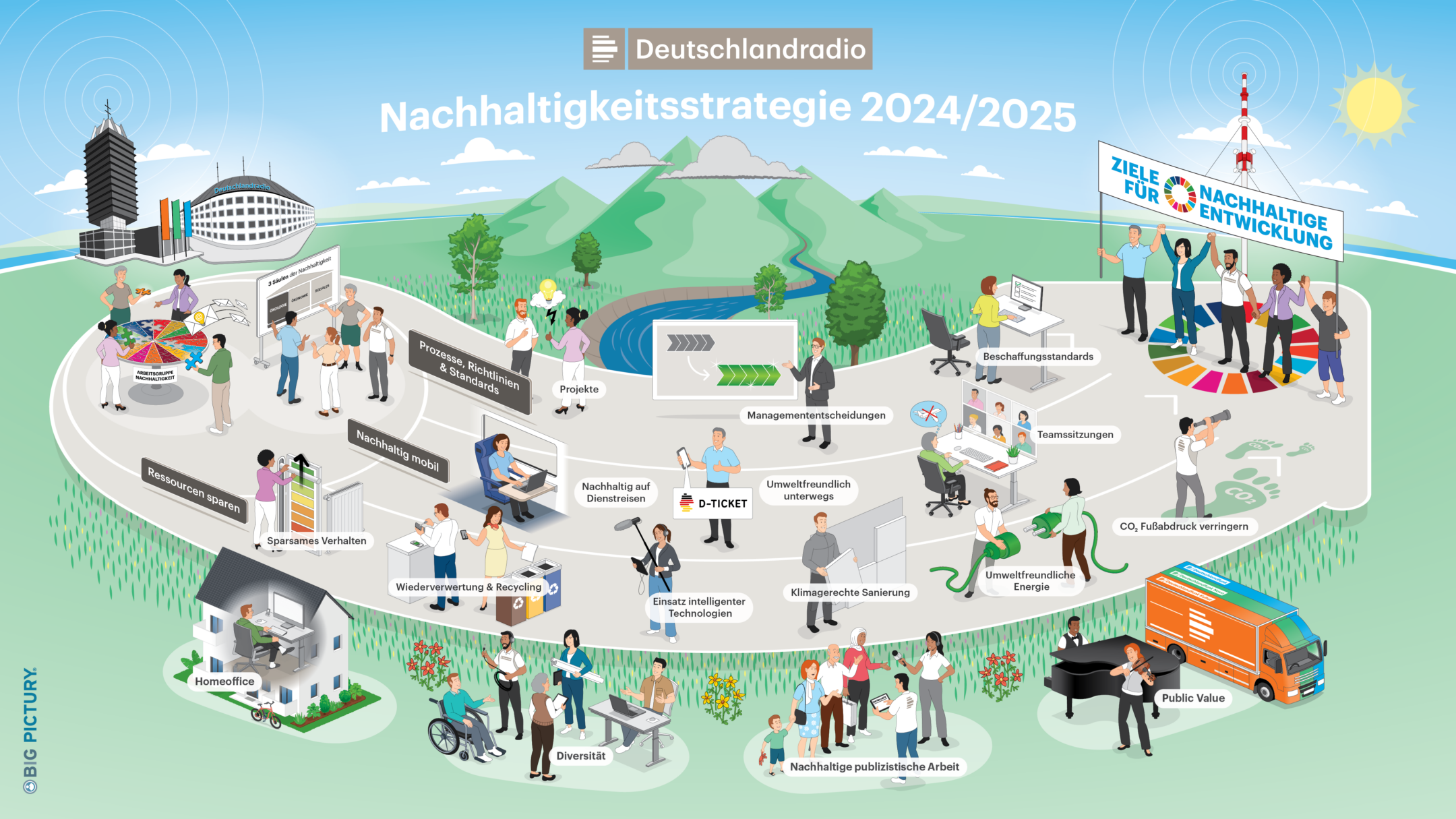 Deutschlandradio hat im Frühjahr 2024 seine Nachhaltigkeitsstrategie verabschiedet. Ziel des Projekts mit Big Pictury war eine Visualisierung, welche die Mitarbeitenden anspricht und die Kernelemente der Nachhaltigkeitsstrategie anschaulich vermittelt. Die besondere Herausforderung für Deutschlandradio als Hörfunkanbieter bestand darin, für einen sehr komplexen, weiten Teil der Belegschaft und einen noch nicht bekannten Prozess, eine geeignete und verständliche Visualisierung zu finden.