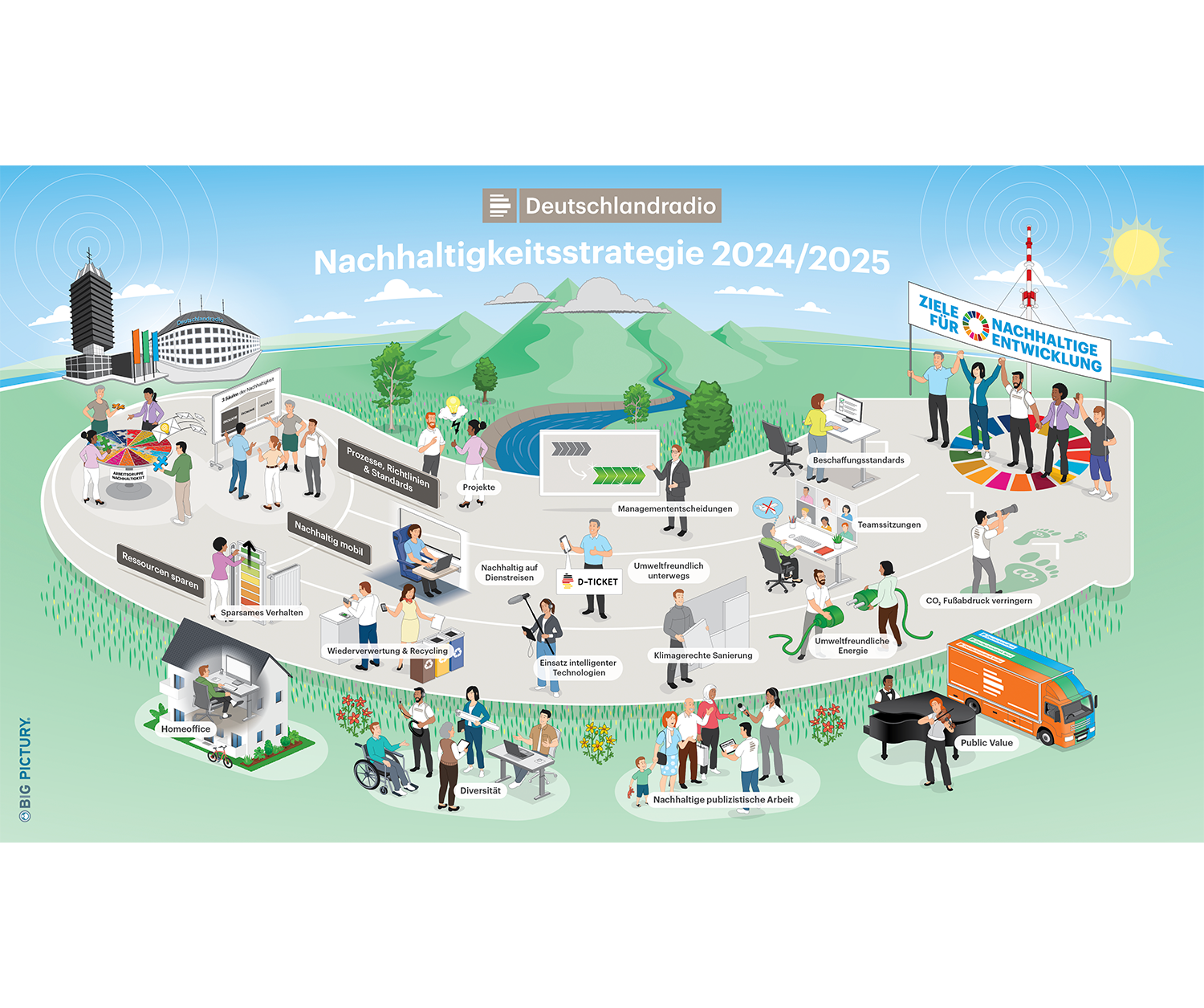 Deutschlandradio hat im Frühjahr 2024 seine Nachhaltigkeitsstrategie verabschiedet. Ziel des Projekts mit Big Pictury war eine Visualisierung, welche die Mitarbeitenden anspricht und die Kernelemente der Nachhaltigkeitsstrategie anschaulich vermittelt. Die besondere Herausforderung für Deutschlandradio als Hörfunkanbieter bestand darin, für einen sehr komplexen, weiten Teil der Belegschaft und einen noch nicht bekannten Prozess, eine geeignete und verständliche Visualisierung zu finden.