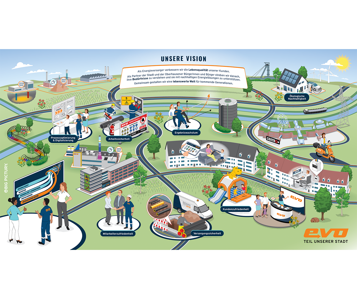 Begleitend zu den Einführungsworkshops entstand ein Big Picture, das die strategischen Leitplanken, die Top-Ziele und die neue Vision greifbar macht. Es verbindet die EVO mit der Stadt und verdeutlicht, dass die Aufgabe als Versorger weit über die Bereitstellung von Energie hinausgeht: Die EVO ist ein integraler Bestandteil der Zukunft Oberhausens, der für Fortschritt, Sicherheit und Lebensqualität sorgt.