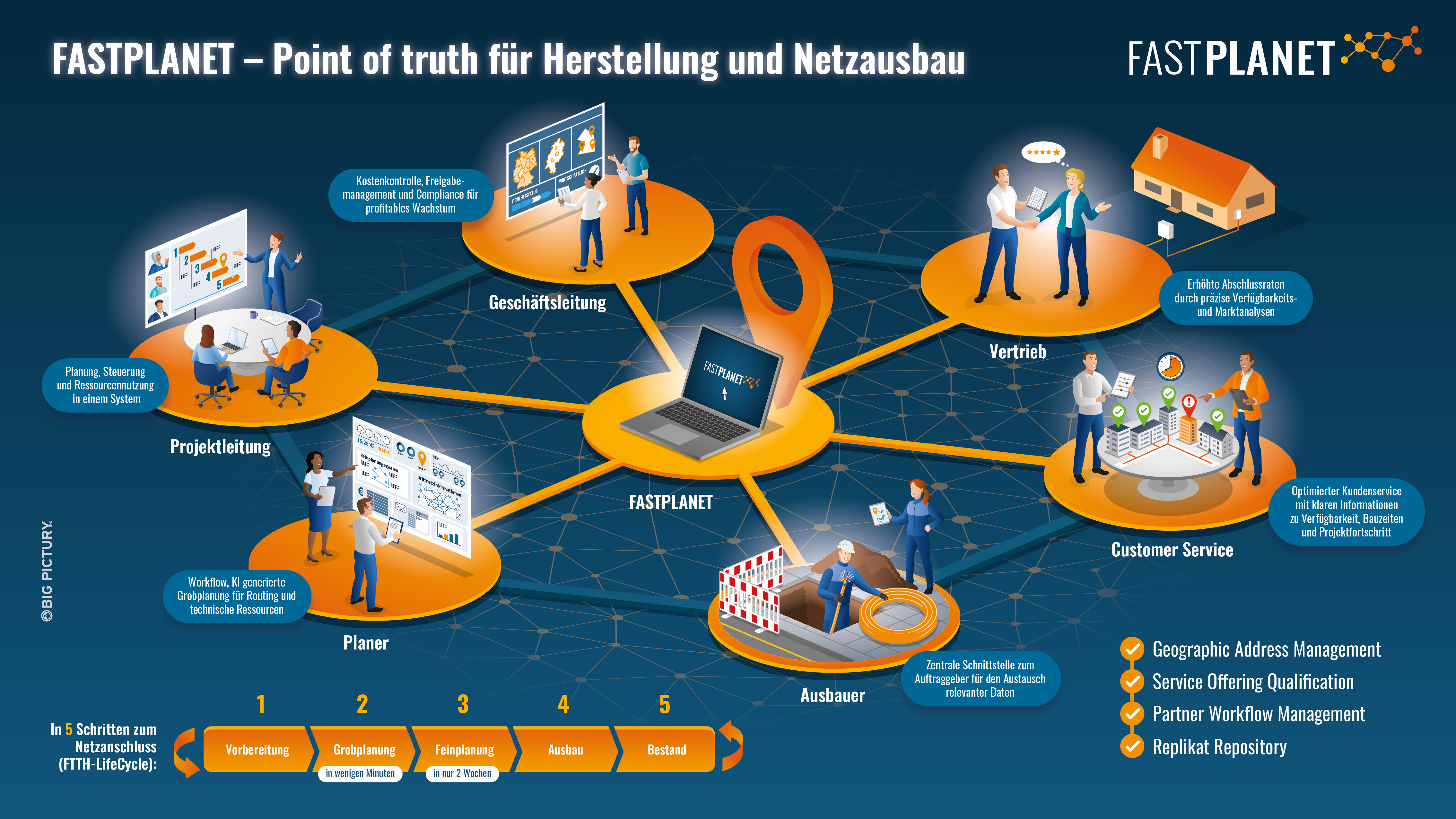 Gemeinsam mit FASTPLANET haben wir ein detailliertes Big Picture entwickelt, das die gesamte Wertschöpfungskette des Unternehmens in einer klar strukturierten und leicht verständlichen Grafik darstellt. Das Bild zeigt die zentralen Prozesse des Netzausbaus – von der Geschäftsleitung über die Projektplanung bis hin zum Ausbau und Kundenservice – und veranschaulicht, wie Fastplanet als „Point of Truth“ alle Akteure miteinander verbindet.