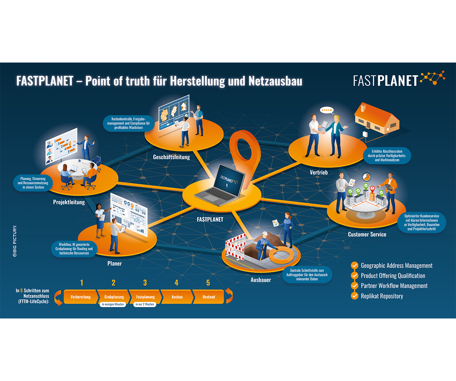 Gemeinsam mit FASTPLANET haben wir ein detailliertes Big Picture entwickelt, das die gesamte Wertschöpfungskette des Unternehmens in einer klar strukturierten und leicht verständlichen Grafik darstellt. Das Bild zeigt die zentralen Prozesse des Netzausbaus – von der Geschäftsleitung über die Projektplanung bis hin zum Ausbau und Kundenservice – und veranschaulicht, wie Fastplanet als „Point of Truth“ alle Akteure miteinander verbindet.