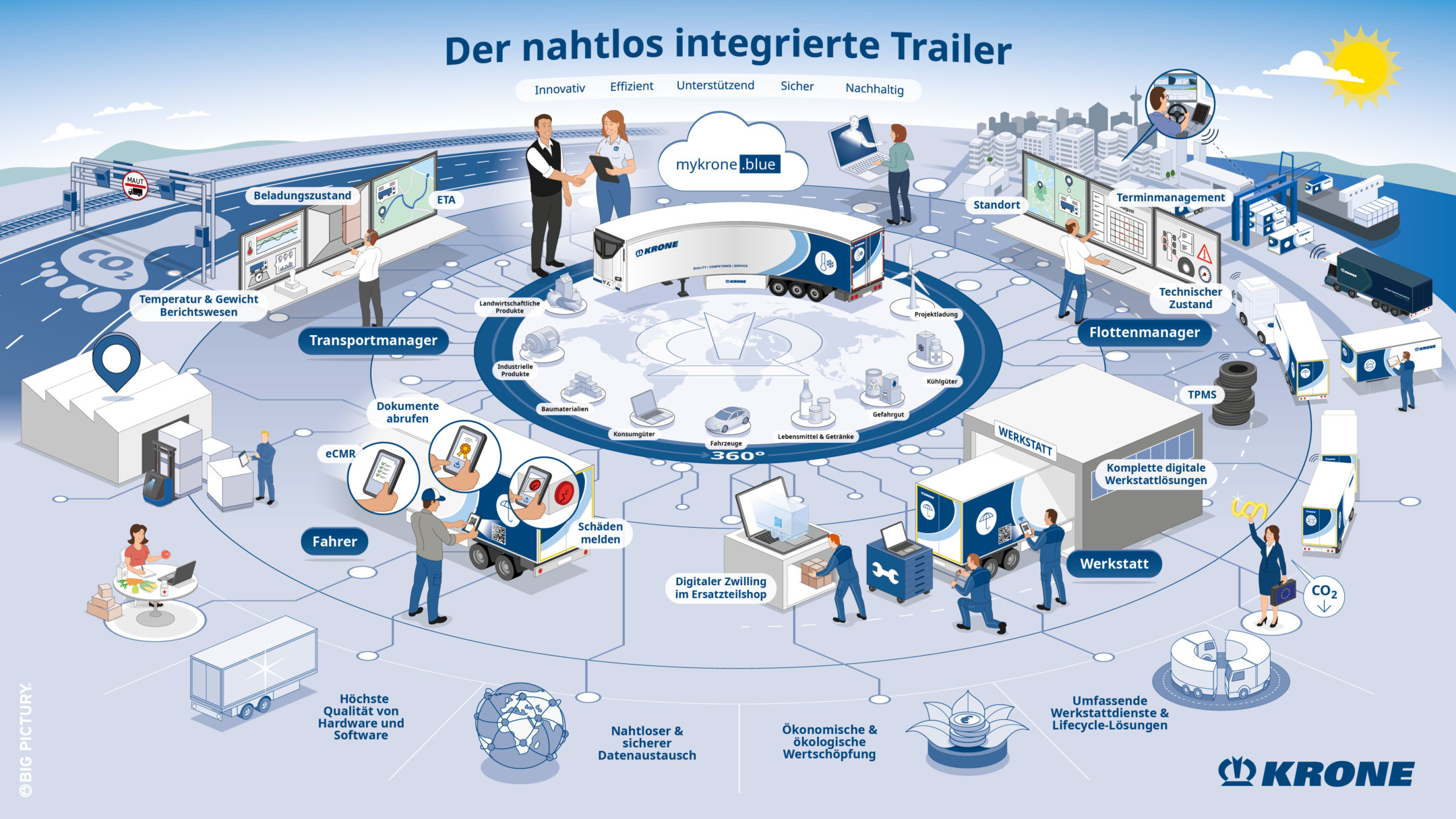 Nachdem Big Pictury die Strategie 2030 der KRONE Group dargestellt hat, werden nun auch einzelne Bereiche des Unternehmens mit einem Big Picture beleuchtet. Die Darstellung des nahtlos integrierten Trailers macht dabei den Anfang.