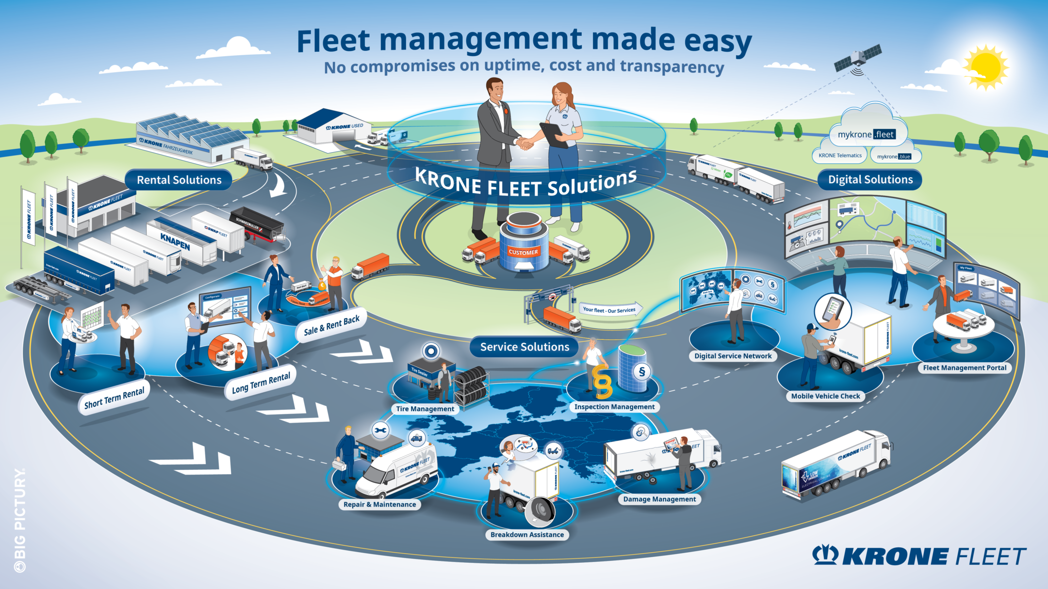 Die KRONE FLEET Gruppe ist ein europaweit aktiver Anbieter ganzheitlicher Flottenlösungen im Bereich Nutzfahrzeuge. Neben flexiblen Mietmodellen bietet das Unternehmen ein breites Spektrum an Service-Leistungen sowie digitale Tools für ein zukunftsfähiges, effizientes und transparentes Flottenmanagement.