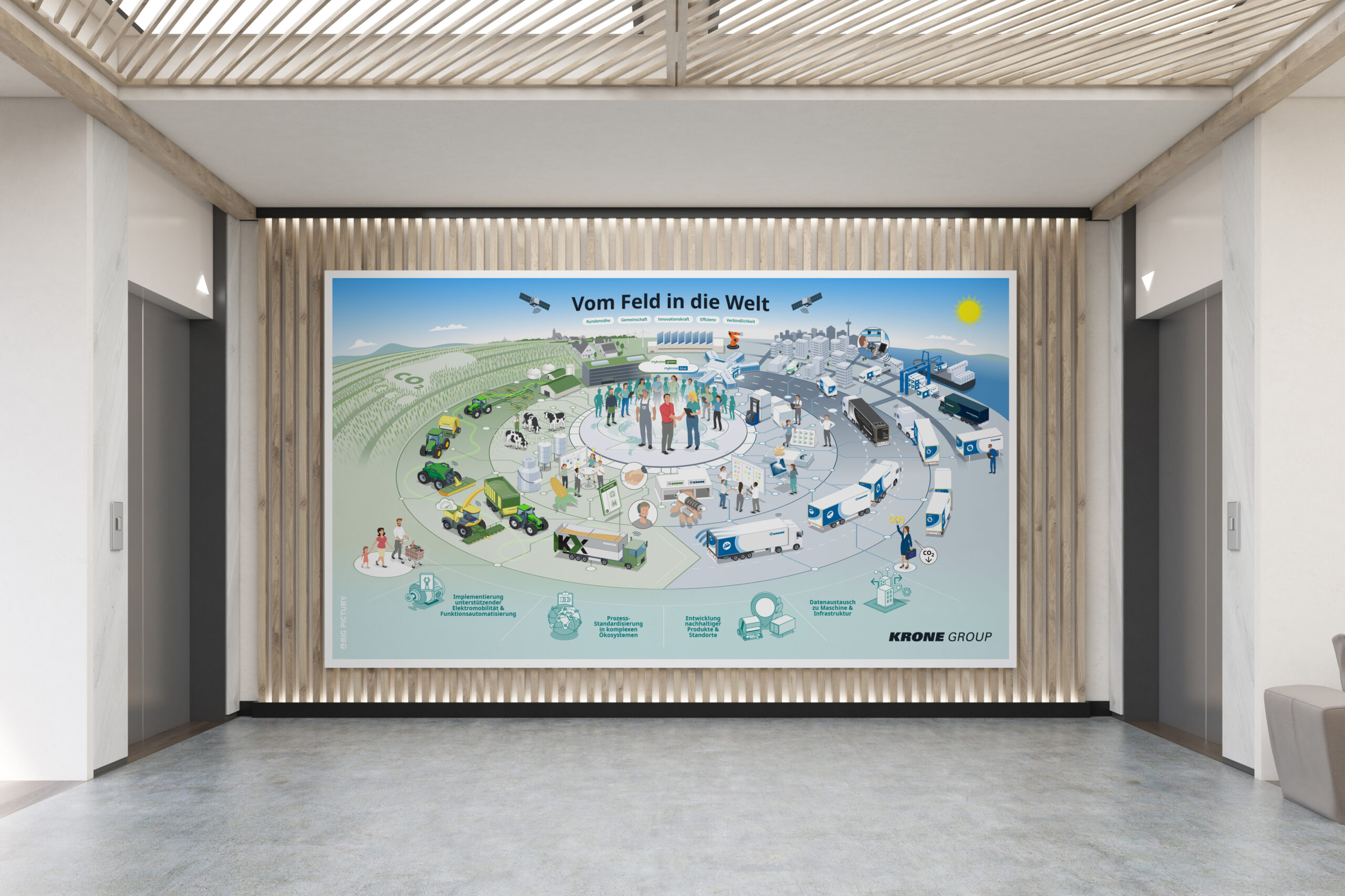 Um die neue Strategie den Mitarbeitenden gegenüber klar und nachvollziehbar zu kommunizieren, entschied sich die Unternehmensgruppe für ein Big Picture. Ziel dieses Big Pictures war die einfache Darstellung der komplexen Zusammenhänge (die Gruppe bedient zwei Geschäftsbereiche: Landtechnik und Nutzfahrzeuge), die Möglichkeit sich selbst auf dem Bild wiederzuerkennen sowie Megatrends und deren Bedeutung für die Geschäftsbereiche erkennbar werden zu lassen. Darüber hinaus sollte das Big Picture dazu beitragen, dass sich die Mitarbeitenden durch das bessere Verständnis ihrer Rolle in der KRONE Group besser mit dem Unternehmen identifizieren.