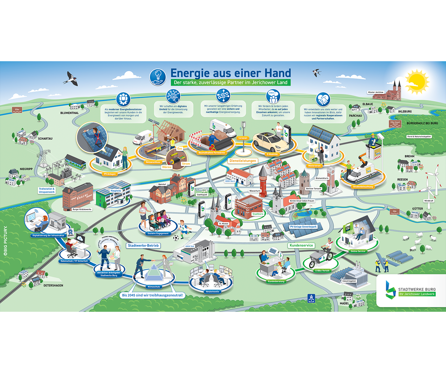 Die Stadtwerke Burg benötigten eine visuelle Lösung, um ihre vielfältigen Dienstleistungen, ihre strategischen Zukunftsziele und ihr Engagement für die Region anschaulich zu präsentieren. Dabei war es besonders wichtig, die Komplexität der Energieversorgung in einer verständlichen und einprägsamen Art darzustellen. Das Big Picture sollte nicht nur die vielfältigen Leistungsbereiche wie Strom, Wärme, Netzausbau und Mobilität abbilden, sondern auch die Bedeutung von Kundenservice, Digitalisierung und Klimaschutz hervorheben. Gleichzeitig sollten markante Gebäude und Wahrzeichen der Stadt Burg für einen regionalen Wiedererkennungswert sorgen.