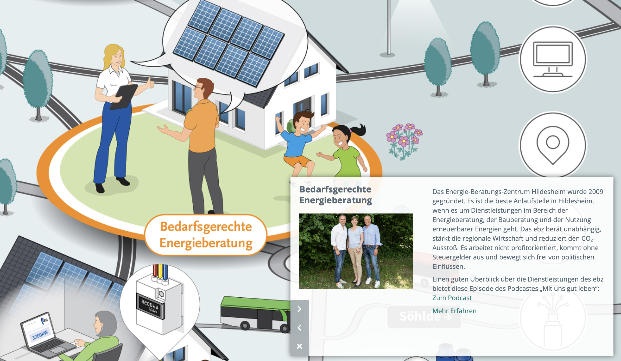 - Die Icons: Jedes Icon steht für einen wesentlichen Leistungsbereich der Stadtwerke Hildesheim und ihrer Tochterunternehmen – von Energieversorgung und Mobilität bis hin zu digitalen Services und Freizeitangeboten. In der digitalen Version fungieren die Icons als Navigationspunkte, über die Nutzer:innen gezielt weiterführende Informationen abrufen können. Ein Klick auf ein Icon öffnet detaillierte Inhalte zu den jeweiligen Leistungen – etwa zur Stromversorgung, Fernwärme, E-Mobilität oder der Hildesheim App.