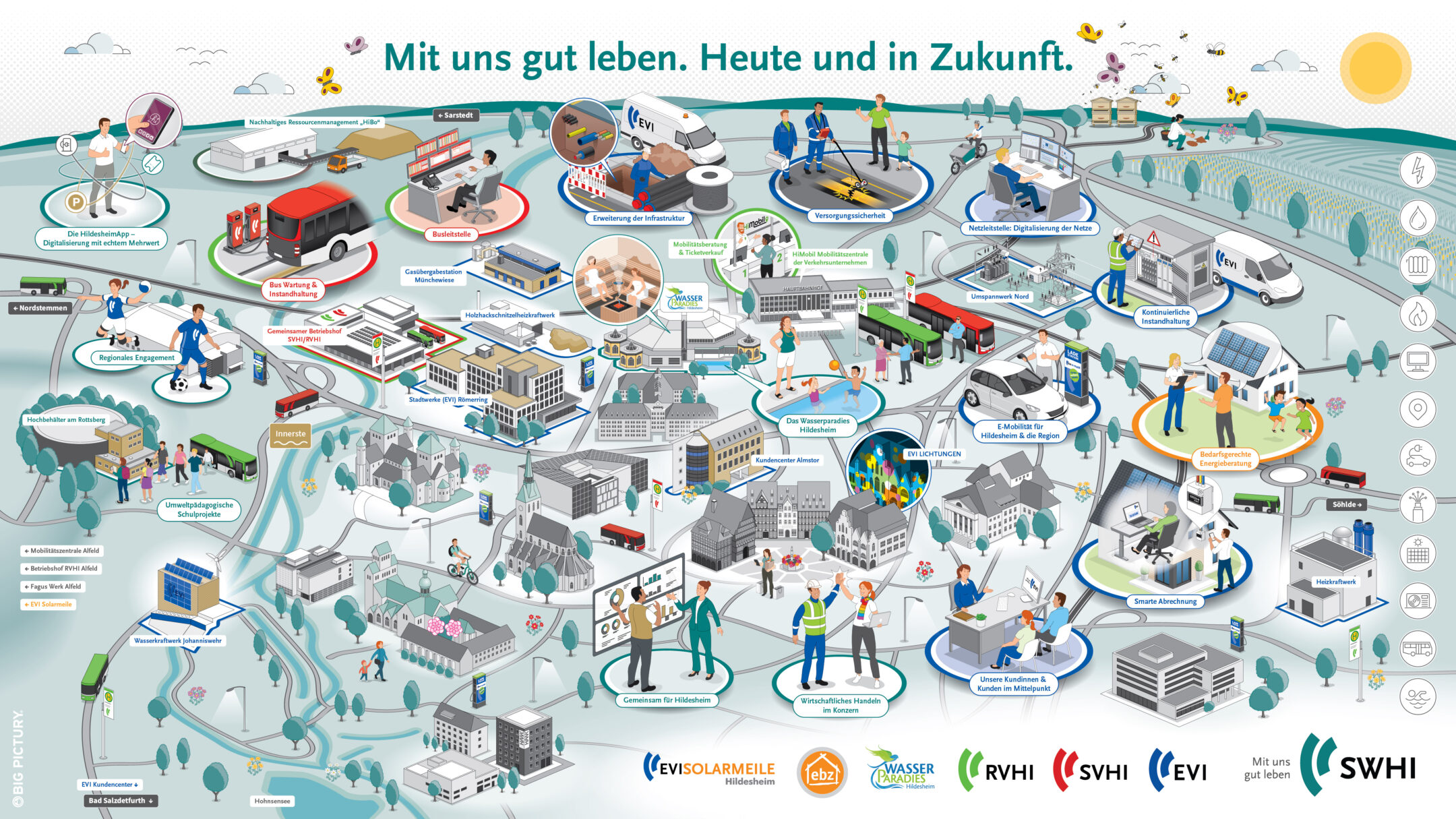 - Die Gebäude: Um eine hohe Wiedererkennbarkeit zu schaffen, sind die bekanntesten Wahrzeichen Hildesheims – darunter historische Bauten und zentrale Orientierungspunkte – im Big Picture dargestellt. Die Gebäude der Stadtwerke Hildesheim sind besonders hervorgehoben und durch eine dicke Umrandung kenntlich gemacht. So wird die Infrastruktur der Stadtwerke sichtbar und deren zentrale Rolle in der Stadtentwicklung unterstrichen.