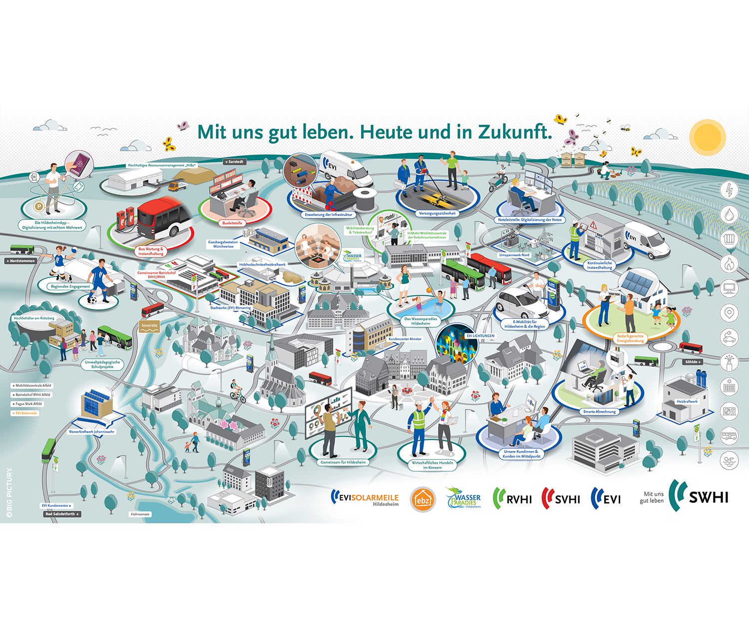Dafür wurde ein Big Picture entwickelt – eine detaillierte visuelle Darstellung, die die komplexen Zusammenhänge der Stadtwerke auf einen Blick erfahrbar macht. Es zeigt, wie die Stadtwerke mit ihren Angeboten und Lösungen das tägliche Leben der Menschen in Hildesheim ermöglichen und verbessern – ganz im Sinne des Mottos: „Mit uns gut leben. Heute und in Zukunft.“