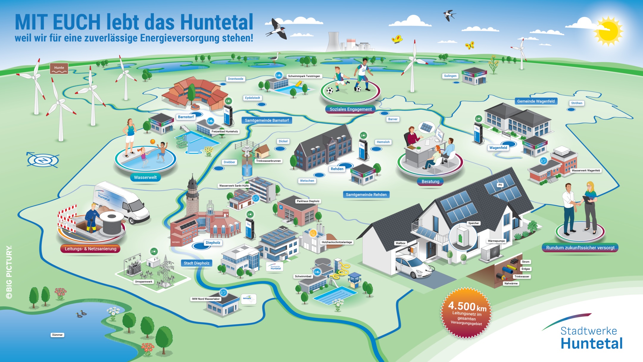 Gemeinsam mit den Stadtwerken Huntetal haben wir ein Big Picture entwickelt, das die gesamte Region mit ihren Orten, Angeboten und Versorgungslösungen visualisiert. Im Bild finden sich zentrale Themen wie erneuerbare Energien, Netzerneuerung, Wasserwerke, Wärmepumpen, Speicherlösungen, Beratung und soziale Verantwortung.