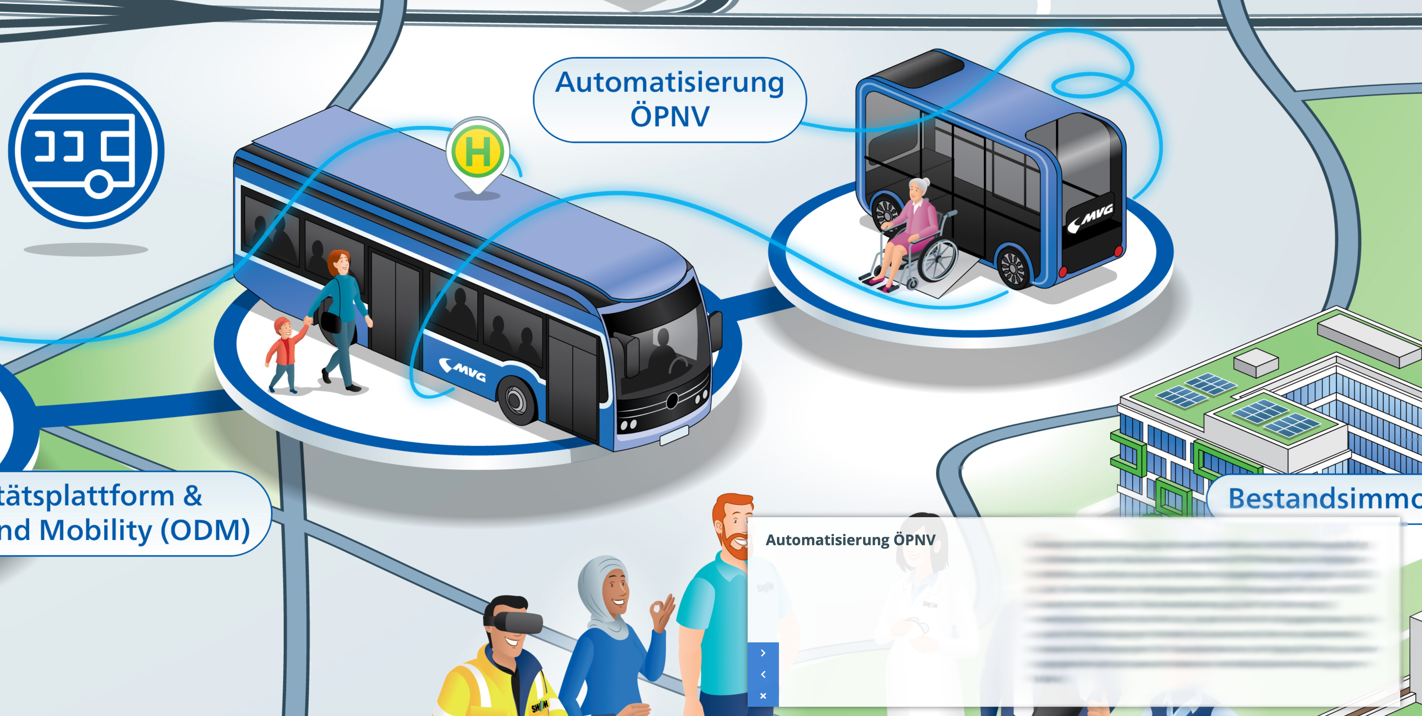 Das interaktive Click Picture erweitert das Big Picture um eine digitale Ebene: Über anklickbare Punkte lassen sich die Themenfelder und Zukunftsprojekte der SWM im Detail entdecken. Jeder Klick führt zu weiterführenden Inhalten – etwa zu erneuerbaren Energien, intelligenter Mobilität, smarten Messsystemen oder nachhaltigen Quartierslösungen.