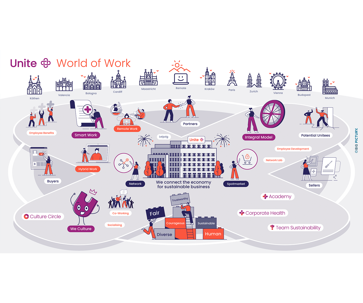 „Das Thema New Work ist ein sehr vielfältiges bei Unite. Das Big Picture hat uns dabei geholfen, den Gästen unseres Headquarter Openings zu visualisieren, wie die unterschiedlichen Konzepte im Großen zusammenwirken. Weitere Einsatzgebiete sehen wir im Recruiting und im Onboarding neuer Mitarbeitender.”
