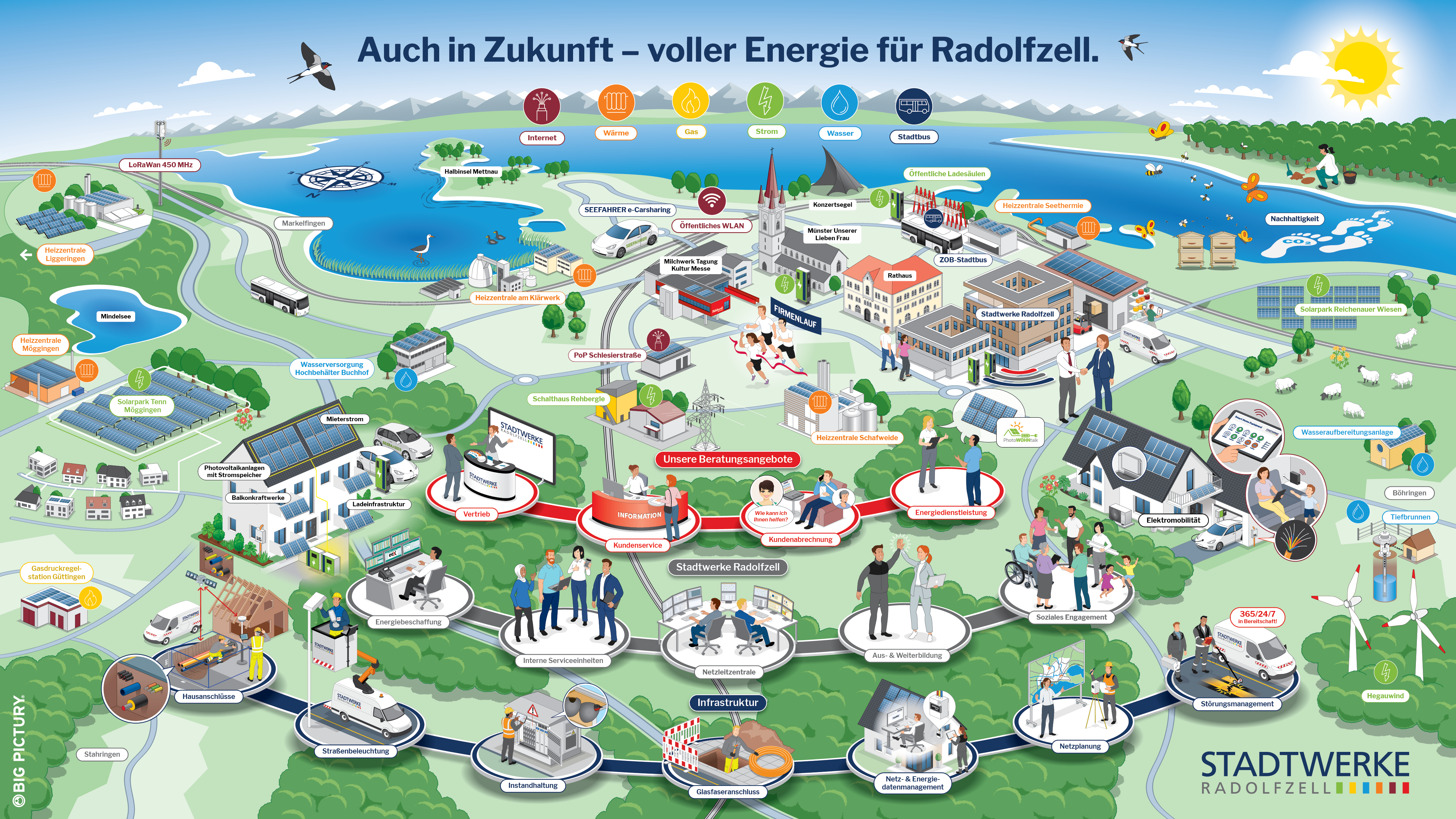 Unser Big Picture für die Stadtwerke Radolfzell zeigt auf einen Blick, wie ein modernes Stadtwerk heute und morgen denkt, arbeitet und Verantwortung übernimmt. Es macht sichtbar, welche Leistungen im Verborgenen wirken – von Versorgungssicherheit und Energiewende über Digitalisierung und Kundennähe bis hin zur Rolle als Arbeitgeber in der Region.