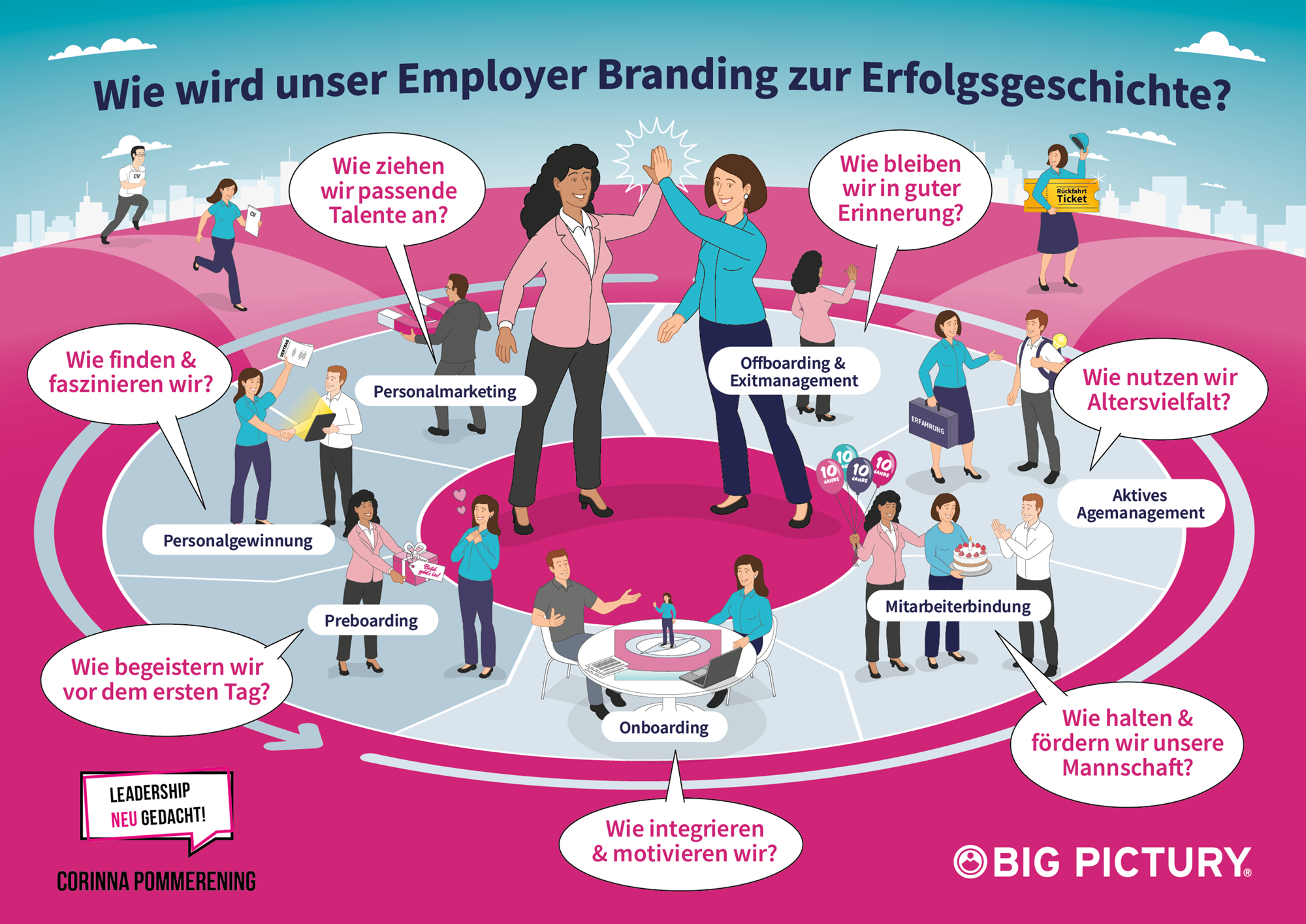 Talente gewinnen und halten mit Big Pictures: Visualisierungen können in vielfältigen Bereichen des Employer Brandings wirkungsvoll eingesetzt werden, von Onboarding-Prozessen bis zur Darstellung von Karrieremöglichkeiten. Big Pictures vermitteln klar und unmissverständlich, was das Herz Ihres Unternehmens ausmacht und welche Rolle Mitarbeitende darin spielen – jetzt und in der Zukunft. Diese visuelle Strategie eignet sich hervorragend, um durch alle Phasen des Recruiting-Prozesses hindurch ein kohärentes und ansprechendes Bild Eures Unternehmens zu zeichnen. Sie verdeutlichen nicht nur, wie das Unternehmen funktioniert, sondern auch, wie sich einzelne Talente in das Gesamtbild einfügen und dazu beitragen können.
