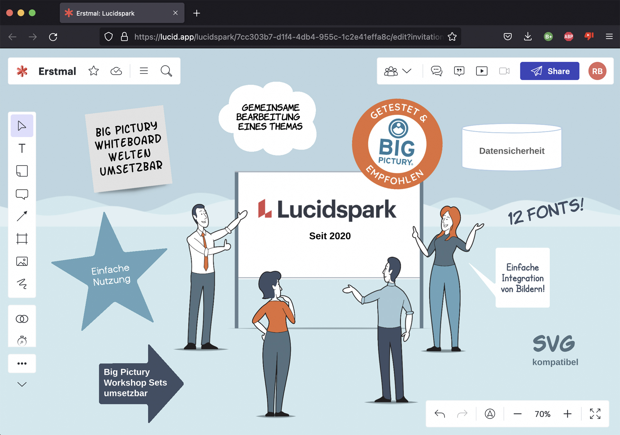 Lucidspark ist ein weiteres auf Teamarbeit und Kollaboration ausgelegtes Online-Whiteboard, das uns vor allem durch seine einfache Bedienbarkeit und die vielen praktischen Vorlagen und Tools für einen schnellen Start bei der Bearbeitung überzeugt hat. Mit Lucidspark könnt Ihr auf euren Online-Whiteboards Texte ebenso wie digitale Notizzettel, Formen und Linien einfügen. Bereits in der Basisversion stehen euch drei bearbeitungsfähige Boards zur Verfügung. Auf jedem Board könnt Ihr bis zu 300 Objekte einladen und bearbeiten. Besonders gut gefallen hat die Funktion „Dot-Voting“, mit welcher die Teilnehmer digital über verschiedene Inhalte auf den Whiteboards mit digitaln „Klebepunkten“ abstimmen können. Für die Abstimmrunden haben die Online-Whiteboards sogar einen Timer integriert. Ebenfalls ansprechend finden wir die Emojis, mit denen die Teilnehmenden Feedback zu den Notizen der anderen abgeben können. Über die Funktion „Anonymer Gast“ könnt Ihr außerdem eure Boards per Link teilen. So können auch Teilnehmer ohne Lucidspark-Konto an Sessions auf eurenWhiteboards teilnehmen.