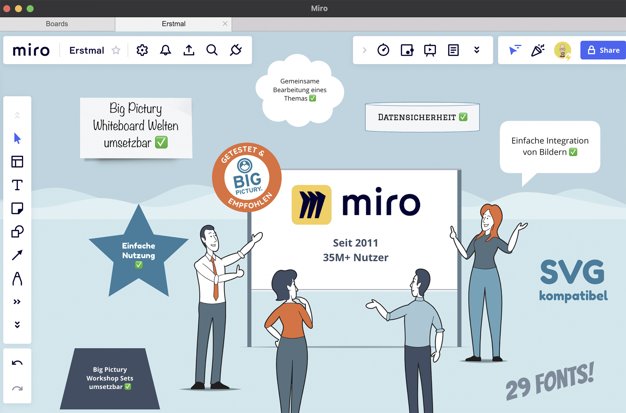 | Conceptboard | **** | ***** | **** | 10 Fonts, keine custom | **** | ***** | Probleme mit SVGs | PNG’s sind gut, also soll gut funktionieren | SVGs * PNGs ***** | Alles in DE | Keine SVGs | Sichere Server in DE. Viele Vorlagen verfügbar. Sehr gute Präsentationsmöglichkeiten. | Stuttgart, Halle (Saale) | 2010 | 2 million + | Ja | ||