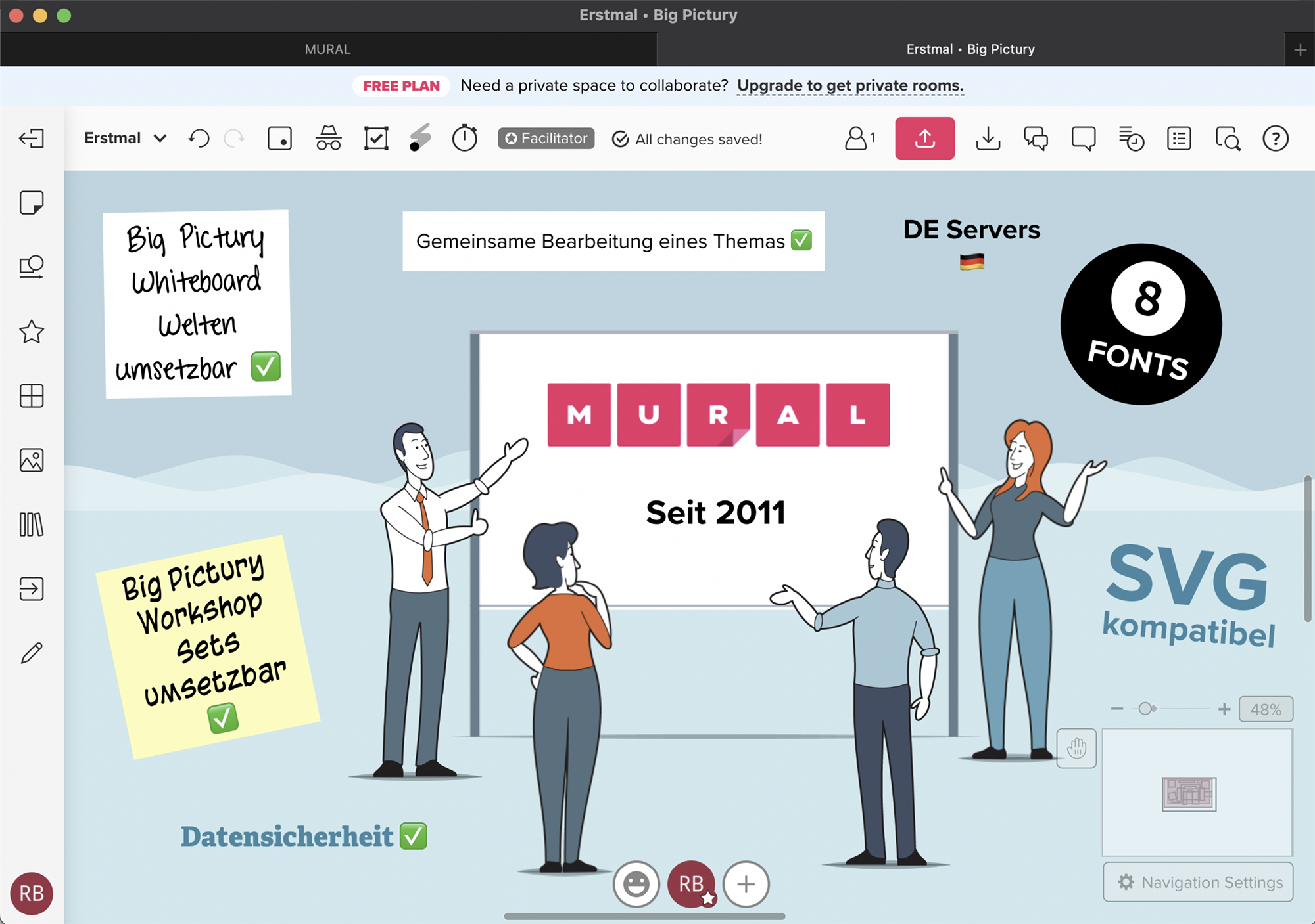 Der US-amerikanische Cloud-Dienst Mural ist eine leistungsstarke Alternative zu unseren anderen Favoriten. Denn Mural bietet alle wichtigen Merkmale eines herausragend guten Online-Whiteboards. Mural ist Flipchart, Pinnwand, Sammelordner sowie Abstimmungs-Tool in einem. Die benutzerfreundliche Oberfläche ist die Grundlage für die Leinwände, die sogenannten „Murals“. Auf diesen Leinwänden können alle Teilnehmer in Echtzeit interagieren. Dabei können Beiträge beispielsweise mit Bildern oder Gifs versehen, Prozesse mit Diagrammen visualisiert oder Notizzettel mit Feedback versehen werden. Gut gefallen hat uns die Mural „Template Bibliothek“, die für Brainstormings, Strategiesitzungen und Produktentwicklungen ebenso praktisch ist wie für die Einführung agiler Methoden. Auch arbeitet Mural unabhängig von Videokonferenzsoftwares: Die Teilnehmer rufen Mural einfach parallel im Browser auf. Für Zoom und Teams bietet der Hersteller integrierbare Apps. Bis zu 5 Pinnwände könnt Ihr in Mural kostenlos anlegen – die Anzahl der Teilnehmer ist dabei nicht beschränkt. Einziges Manko an Mural: Für viele öffentliche Einrichtungen dürfte das Online-Whiteboard nicht in Frage kommen, da die Datenschutzerklärung nicht DSVGO-konform ist.